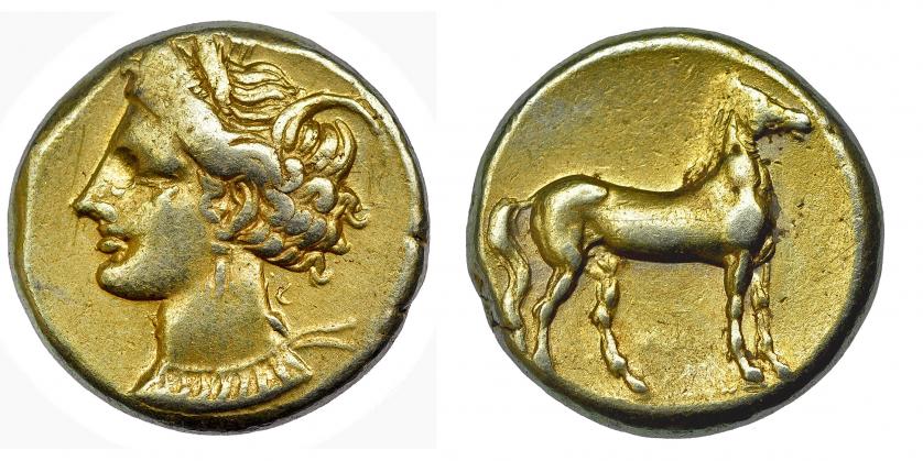 ZEUGITANIA. Cartago. Estátera electro. A/ Cabeza de Tanit a izq. R/ Caballo parado sobre línea a der. EL 7,5 g. J-299. MBC-.
