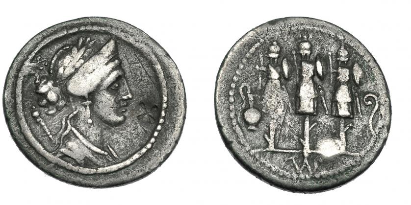 154   -  CORDIA. Denario. Roma (46 a.C.). A/ Cabeza de los Dióscuros con pilei y corona de laurel. R/ Venus a izq. FFC-603. Sb-2a. Craw-463.1a. Contramarca. MBC-.