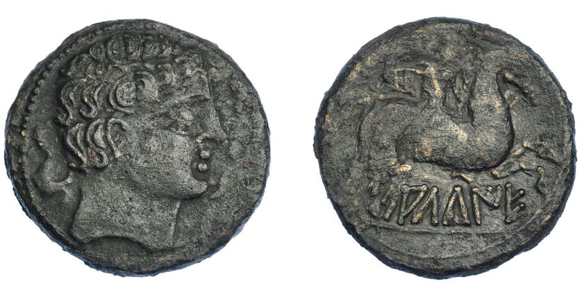 3018   -  HISPANIA ANTIGUA. BILBILIS. Semis. A/ Cabeza masculina a der., delante delfín, detrás signo ibérico S. R/ Caballo con rienda suelta a der., encima creciente con glóbulo, debajo sobre línea BiLBiLIS. AE 7,41 g. 21,7 mm. I-267. ACIP-1578. Pátina oscura rugosa. BC+. Muy escasa.