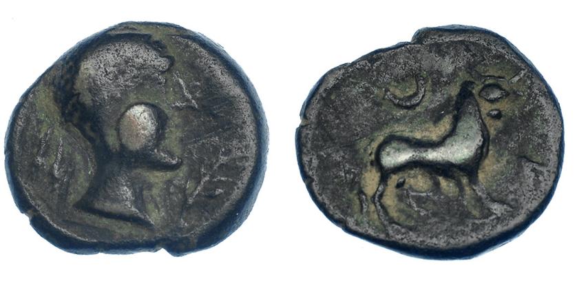 3025   -  HISPANIA ANTIGUA. EMISIONES HISPANO-CARTAGINESAS. Quinto. A/ Cabeza de Tanit a izq. R/ Casco a izq. AE 1,53 g. 12,2 mm. I-521. ACIP-582. Golpe en rev. Pátina oscura. BC+/MBC-.