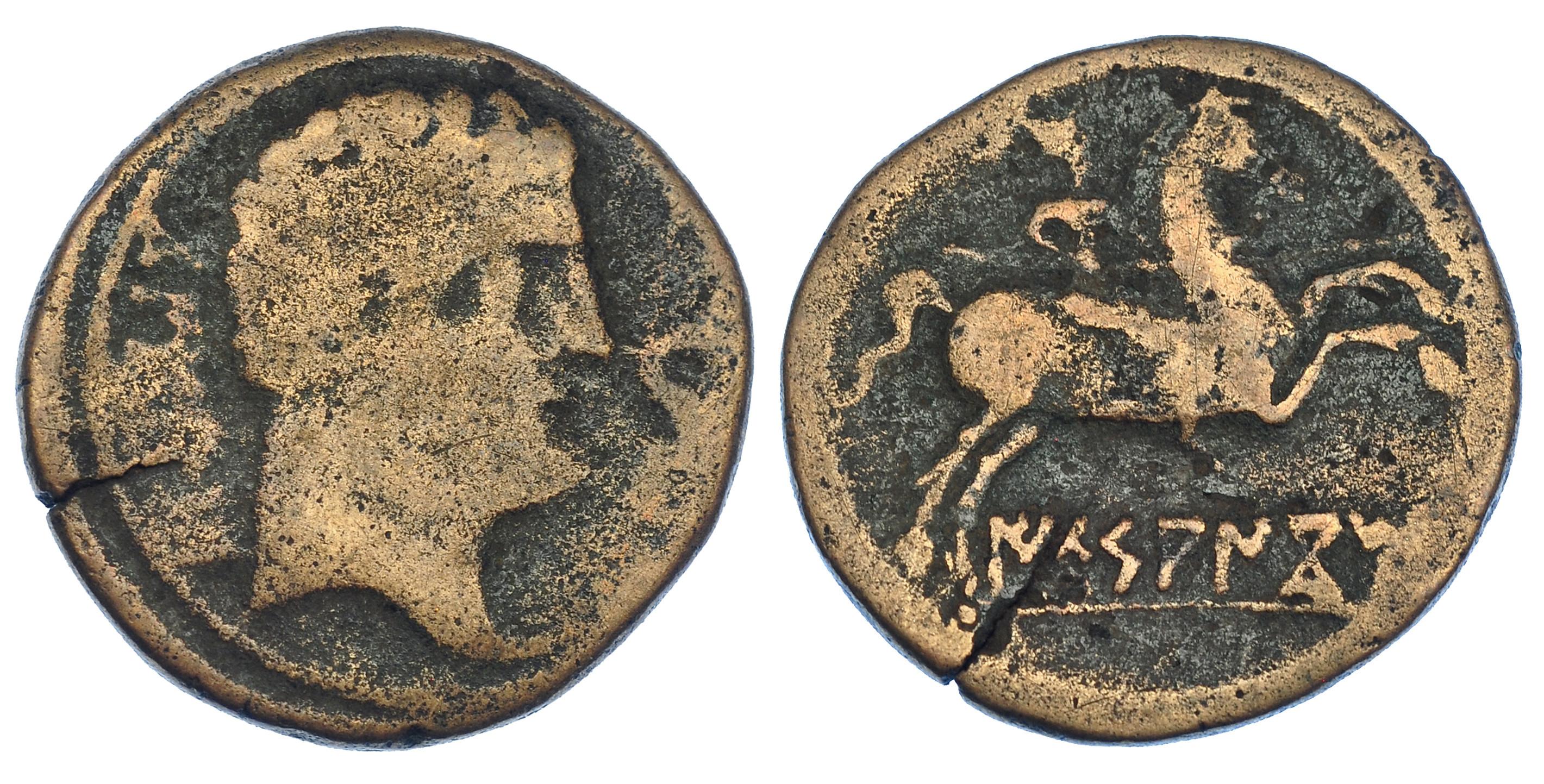 IKESANKOM. Unidad o as. A/ Cabeza masculina a der., delante delfín, detrás ley. ibérica (KoN)BoUTo. R/ Jinete lancero a der., debajo, sobre línea, ley. ibérica IKeSANKoM. CNH-1. I-1421. ACIP-1599. Cospel abierto. BC-/BC.