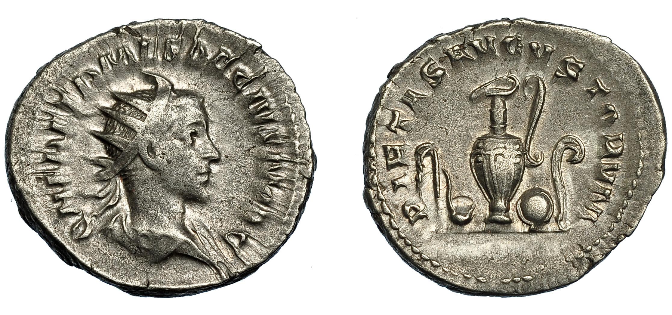 HERENIO ETRUSCO. Antoniniano. Roma (250-251). R/ Instrumentos sacerdotales; PIETAS AVGVSTOTVM. VE 4,59 g. 22,9 mm. RIC-145. MBC/MBC+. Escasa.