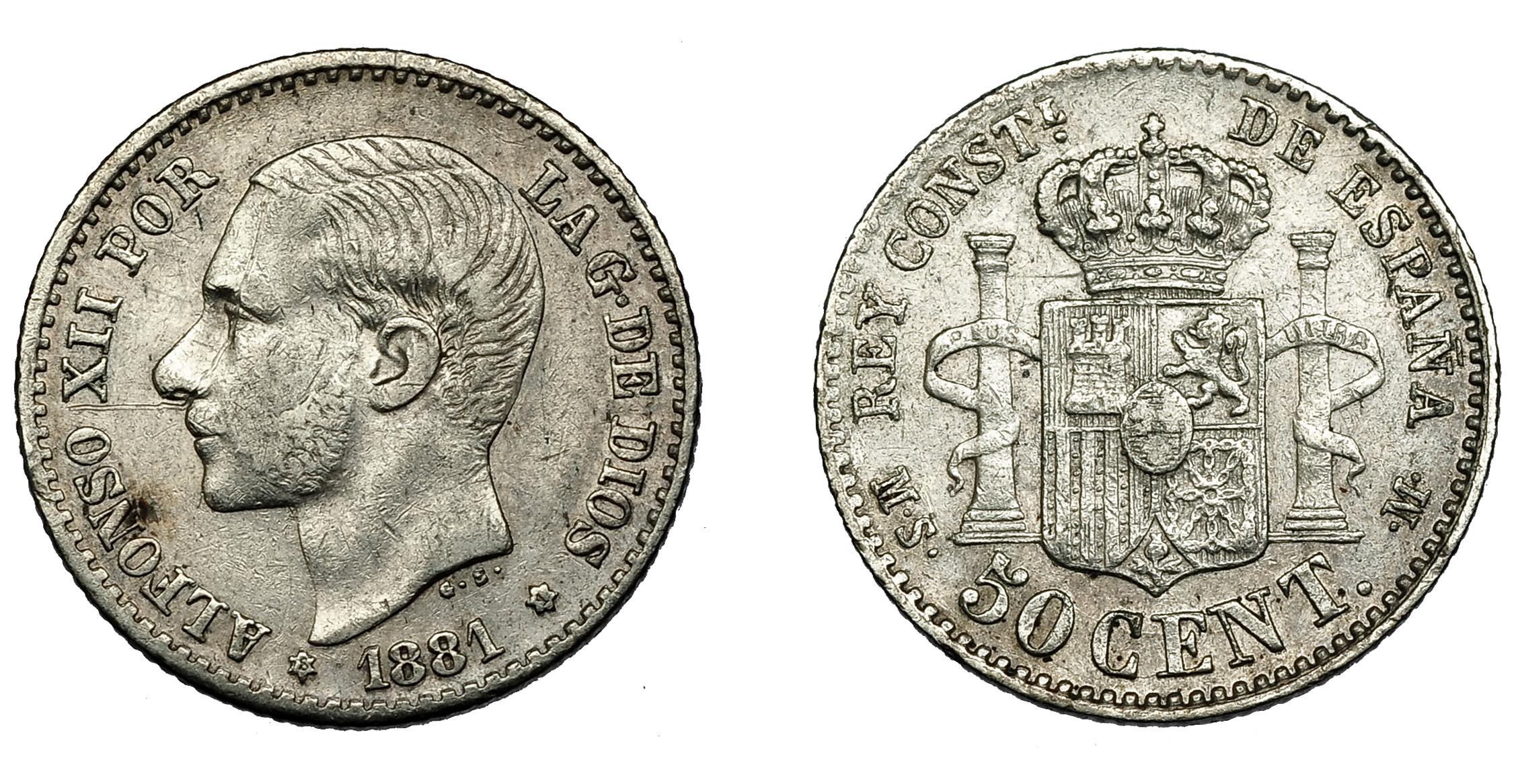 ALFONSO XII. 50 céntimos. 1881 *8-1. Madrid. MSM. VII-49. Raya en anv. MBC.