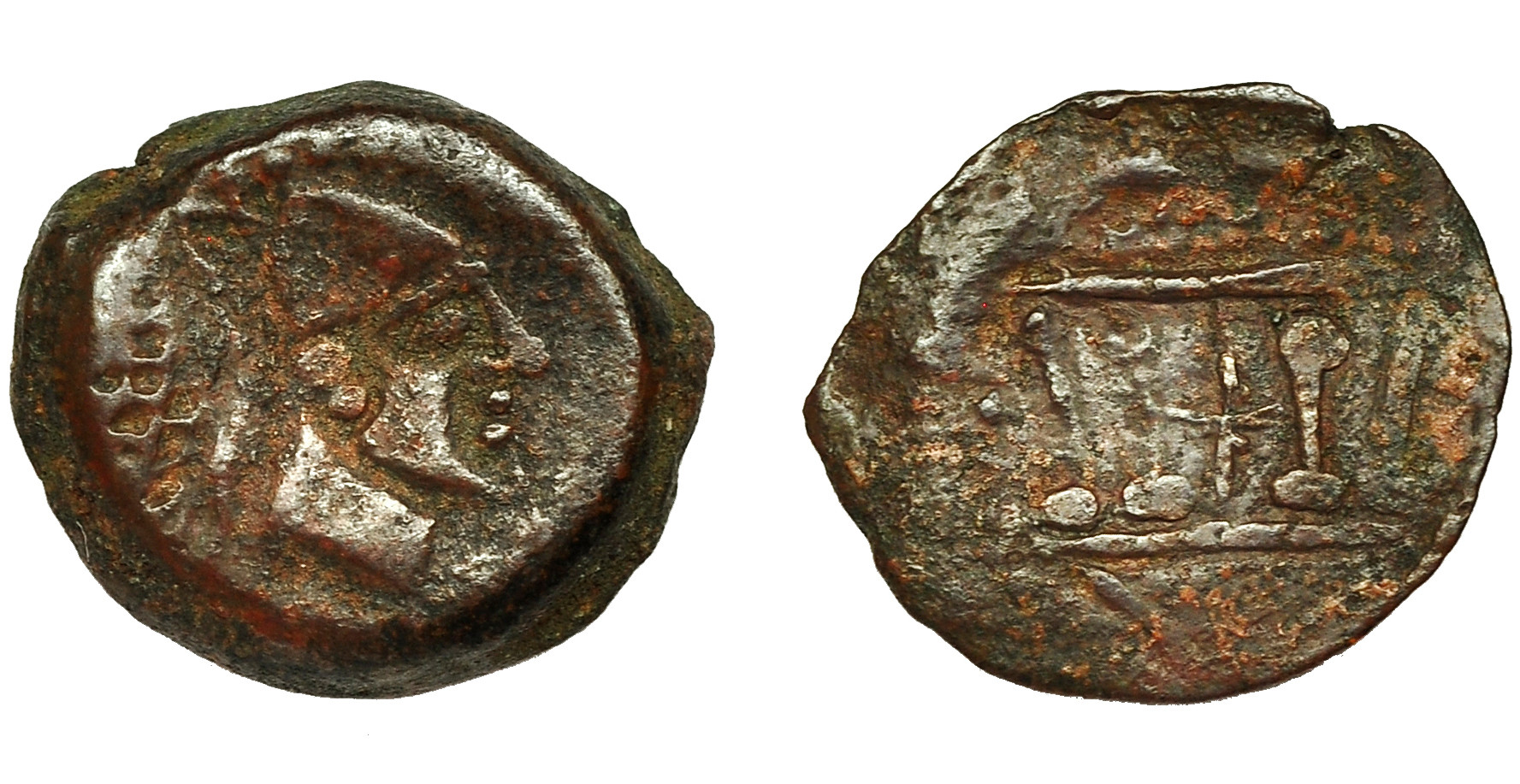 HISPANIA ANTIGUA. MALAKA. Mitad. A/ Cabeza de Vulcano a der. con gorro cónico, detrás mlk' y tenazas. R/ Templo tetrástilo. AE 5 g. 18,4 mm. I-1738. ACIHISPANIA ANTIGUA. MALAKA. -794. BC+. Rara.