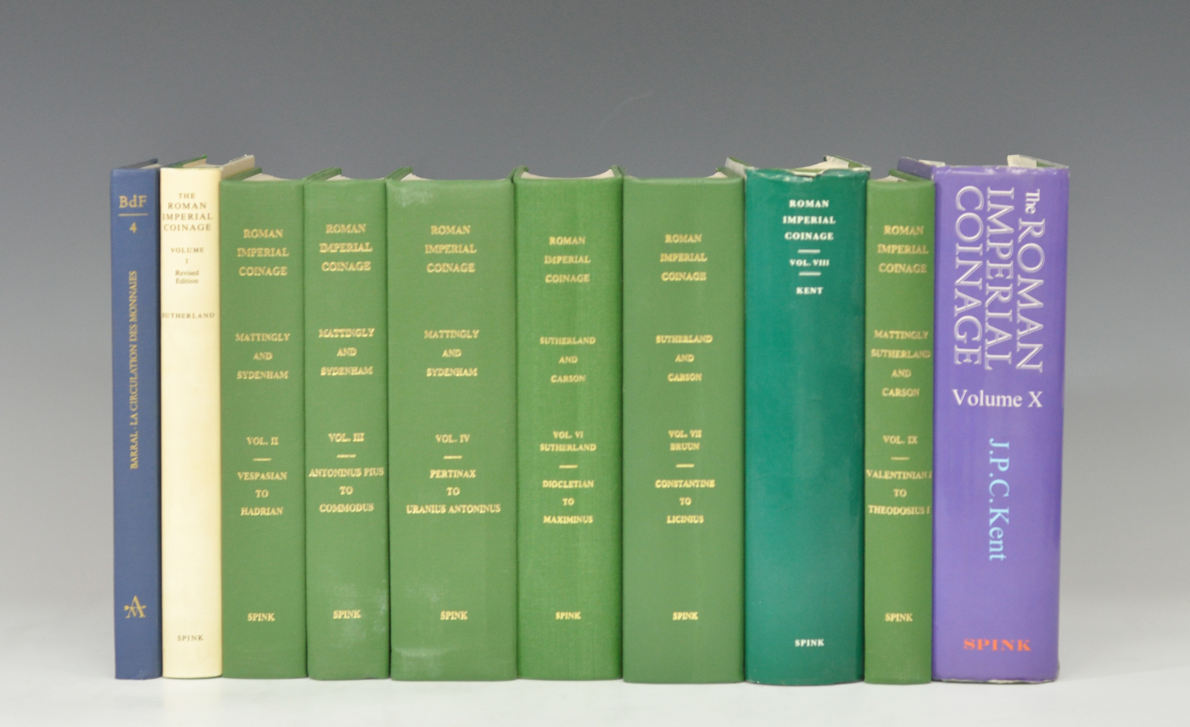 LIBROS. VV. AA. Roman Imperial Coinage, vols. I (1984), II (1926), III (1930), IV (1936), VI (1967), VII (1966) y IX (1988), X (1994). Todos tapa dura, vol. X con sobreguarda.