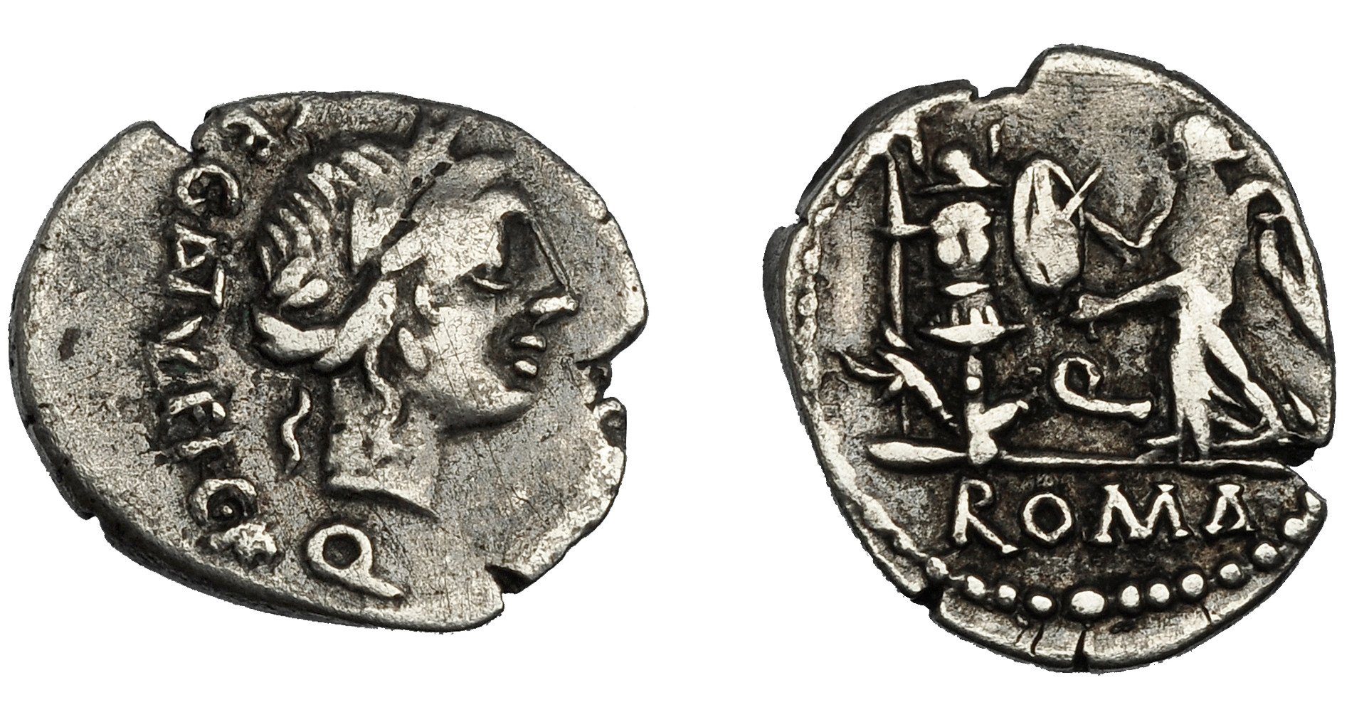 REPÚBLICA ROMANA. EGNATULEIA. Quinario. Roma (97 a.C.). A/ Cabeza de Apolo a der., detrás C EGNATVLEI C F Q. R/ Victoria a izq. escribiendo en escudo de trofeo militar; en campo Q y en exergo ROMA. AR 1,70 G. 16 mm. CRAW-333.1. Cospel abierto. MBC-