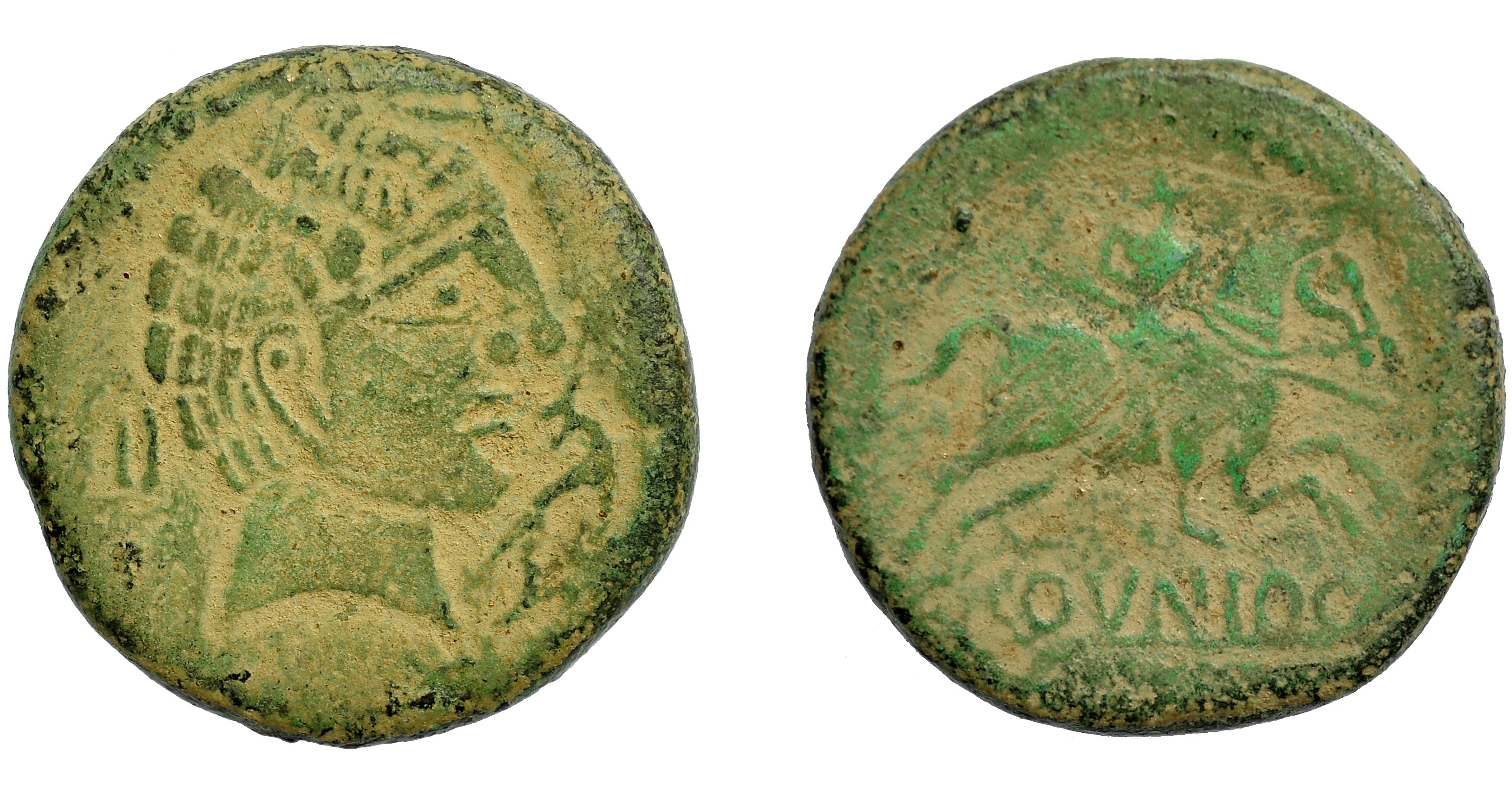 HISPANIA ANTIGUA. CLUNIA. As. A/ Cabeza masculina a der., delante delfín, detrás II. R/ Jinete lancero a der.; CLOVNIOQ. AE 13,86 g. 26,4 mm. I-833. ACIP-1825. Pátina verde claro. MBC-.