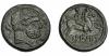 HISPANIA ANTIGUA. BELIKION. As. A/ Cabeza masculina a der., alrededor 3 delfines. R/ Jinete lancero a der., debajo BeLIKiON. AE 10,35 g. 23,6 mm. I-244. ACIP-1437. Pátina oscura rugosa. MBC+. Muy rara.