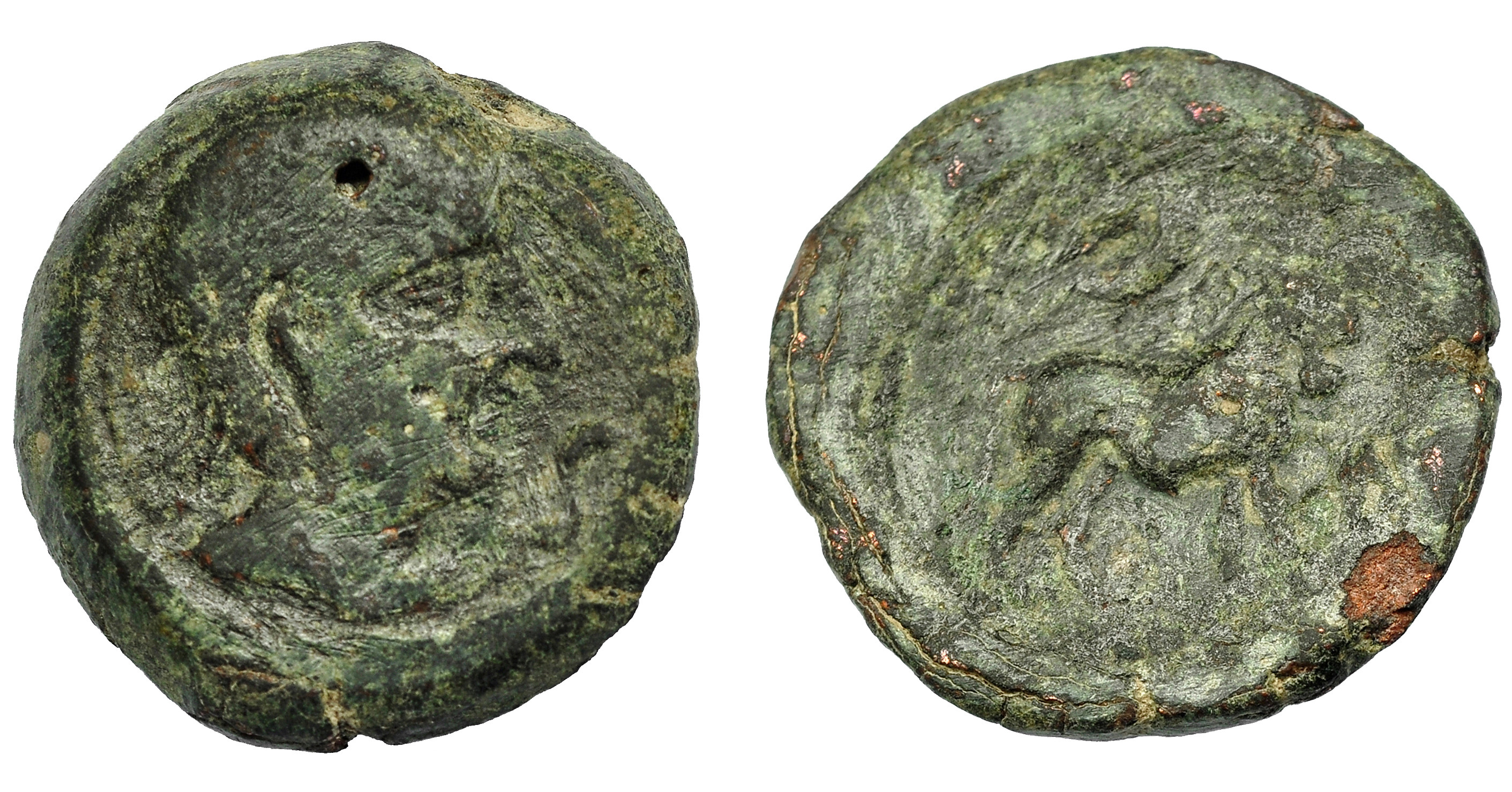 HISPANIA ANTIGUA. CASTULO. Semis. A/ Cabeza masculina diademada a der., delante S. R/ Toro parado a der., encima creciente, delante signo ibérico S, debajo KaSTiLO (no visible). AE 9,97 g. 22,6 mm. I-715. ACIP-2116. Pátina verde con erosiones. Bc+/BC-.
