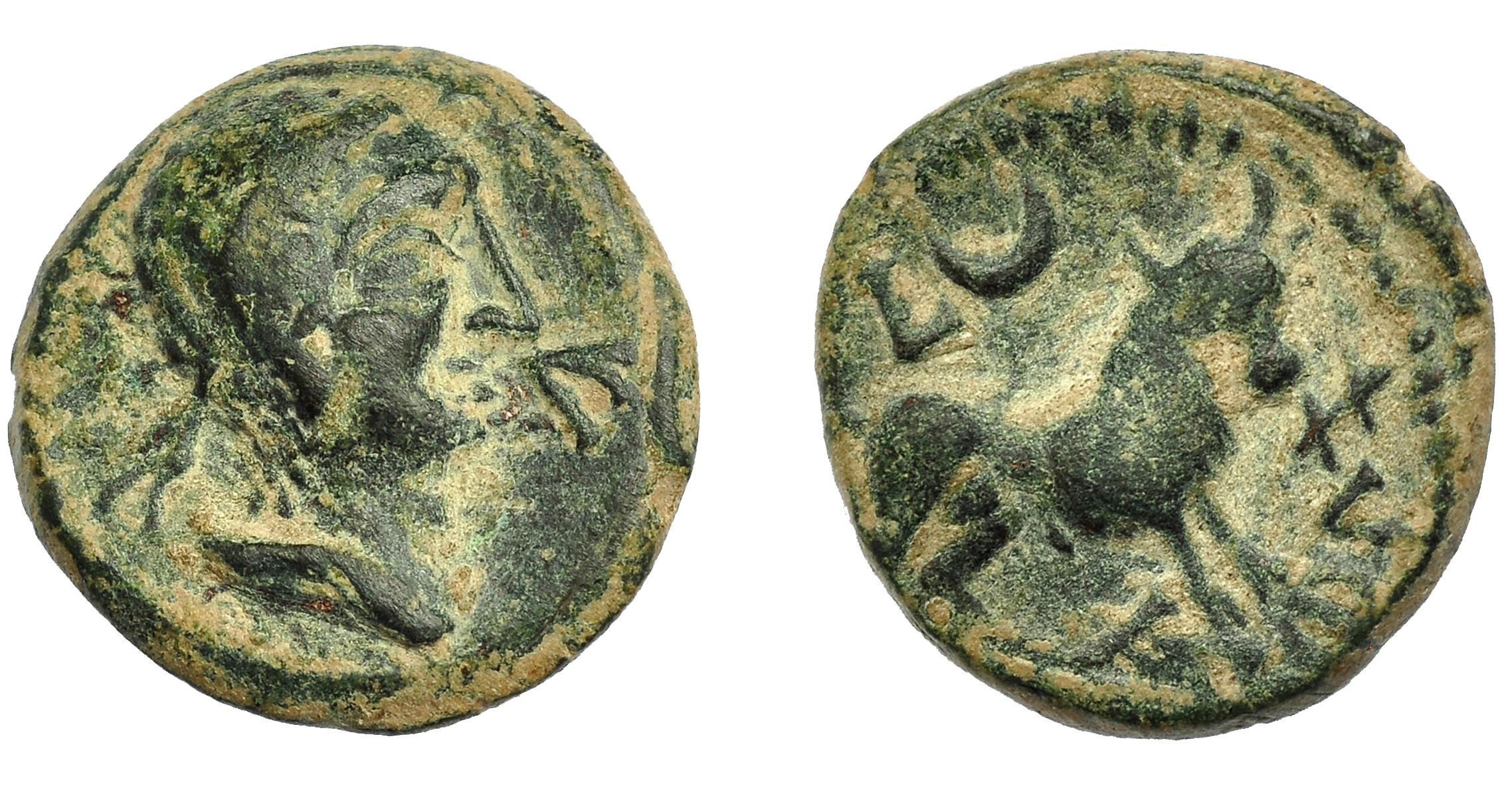 HISPANIA ANTIGUA. CASTULO. Semis. A/ Cabeza masculina diademada a der., delante signo ibérico Ka. Estilo tosco. R/ Toro a der., encima L y creciente, debajo bajo línea KaSTiLO. AE 4,51 g. 17,7 mm. I-725. ACIP-2158. Pátina verde. MBC/MBC-. Muy rara.
