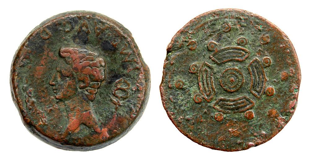 EMISIONES DEL NOROESTE. Sestercio. Augusto. A/ Cabeza a izq., detrás caduceo, delante palma; IMP AVG DIVI F externa. R/ Caetra; alrededor dos orlas de tachones circulares. AE 38,07 g. RPC-1. APRH-1 (mismo ejemplar ilustrado) ACIP-3299 (mismo ejemplar ilustrado) CC-3829 (mismo ejemplar). Pátina verde con tonos rojos. El mejor ejemplar de los dos conocidos. MBC-/MBC. Extraordinariamente rara. La guerra contra cántabros y astures supuso la culminación de la conquista de la Península Ibérica por Roma, en una época tan tardía como la del gobierno de Augusto (29-19 a.C.). El conflicto implicó a nada menos que cinco legiones, que se establecieron en campamentos ubicados al sur de la cordillera cantábrica, como Segisama (Sasamón, Burgos), Pisoraca (Herrera de Pisuerga, Palencia), Legio (León), Asturica Augusta (Astorga, León), etc.Entre el circulante recuperado en estos campamentos se encuentran unas monedas de bronce anónimas que son conocidas normalmente como “del Noroeste” o “de la caetra”. Este último nombre viene por el tipo principal utilizado para los reversos, un escudo redondo, denominado rodela o caetra, que, según cuentan los historiadores romanos, era el utilizado por los pueblos hispanos. La panoplia de estos guerreros se completaba con un tipo de espada de hoja curva conocida como falcata y la lanza. Dentro de estas emisiones se acuñaron tres valores, sestercios, dupondios y ases, siendo el más raro el mayor, el sestercio, del que únicamente se conocen tres ejemplares. En cuanto al lugar de acuñación, se ha propuesto que fuera Emerita (Mérida, por la similitud con las acuñaciones romanas de Publio Carisio) o Lucus Augustus (Lugo, donde aparecieron algunos posibles cospeles), aunque es muy posible que nos encontremos ante una o varias cecas móviles que se desplazaban con el ejército.