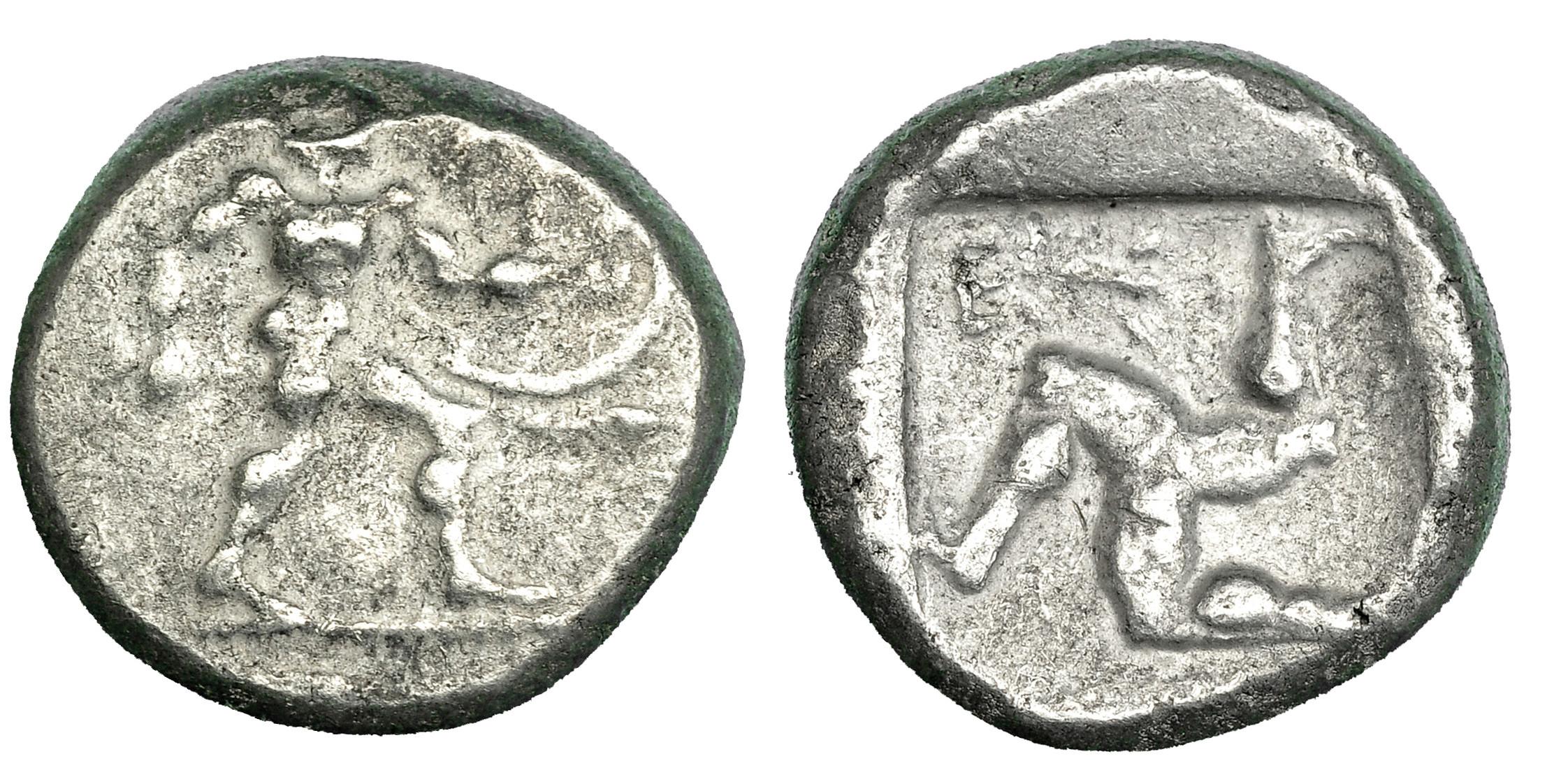 PANFILIA. Aspendo. Estátera (s. V a.C.). A/ Guerrero desnudo luchando a der. R/ Trisqueles en cuadrado incuso; en campo E y símbolo. AR 10,80 g. COP-155 (vte.). MBC-/MBC.