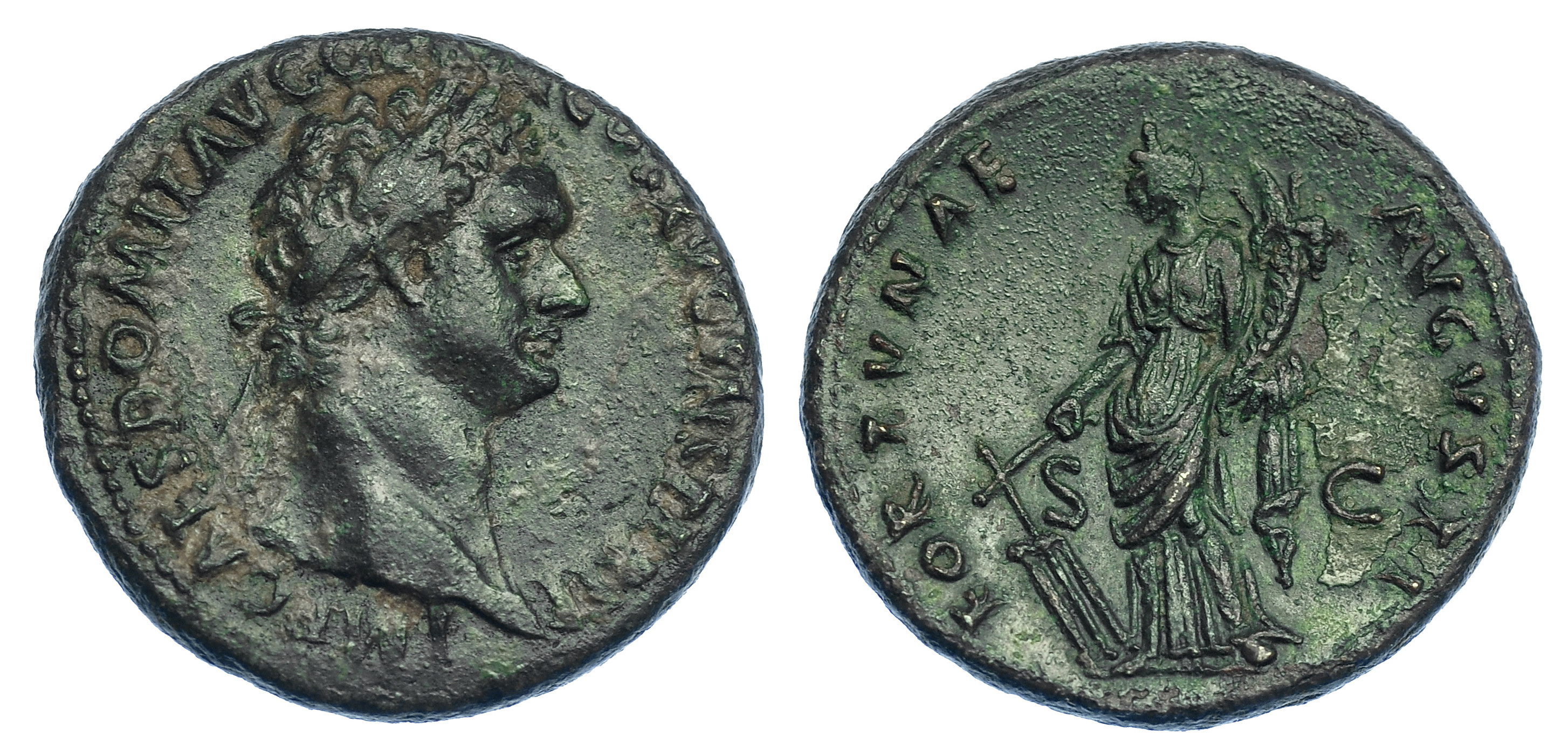 IMPERIO ROMANO. DOMICIANO. As. Roma (90-91 d.C.). A/ Busto laureado a der.; IMP CAES DOMIT AVG GERM COS XV CENS PER P P. R/ Fortuna a izq. con timón y cornucopia; FORTVNAE AVGVSTI, SC. AE 11,72 g. 28,5 mm. RIC-707. Pátina verde. MBC/MBC+.