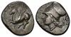 GRECIA ANTIGUA. CORINTO. Corintia. Estátera (c. 315-310 a.C.). A/ Pegaso volando a izq., debajo q. R/ Cabeza de Atenea a izq., delante D, detrás I y figura con caduceo y cornucopia. AR 8,13 g. 20,55 mm. COP-99-100. SBG-2631 vte. Erosiones. MBC. Ex colección Guadán, 2097.