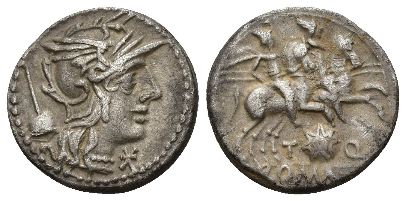 REPÚBLICA ROMANA. QUINCTIA. T. Quinctius Flaminius. Denario. Roma (126 a.C.). A/ Cabeza de Roma a der.,detrás apex. R/ Dióscuros a der., debajo escudo macedonio entre T y Q, exergo ROMA. AR 3,80 g. 18,09 mm. CRAW-267.1. FFC-1084. Defecto de cospel al borde. MBC/MBC-.
