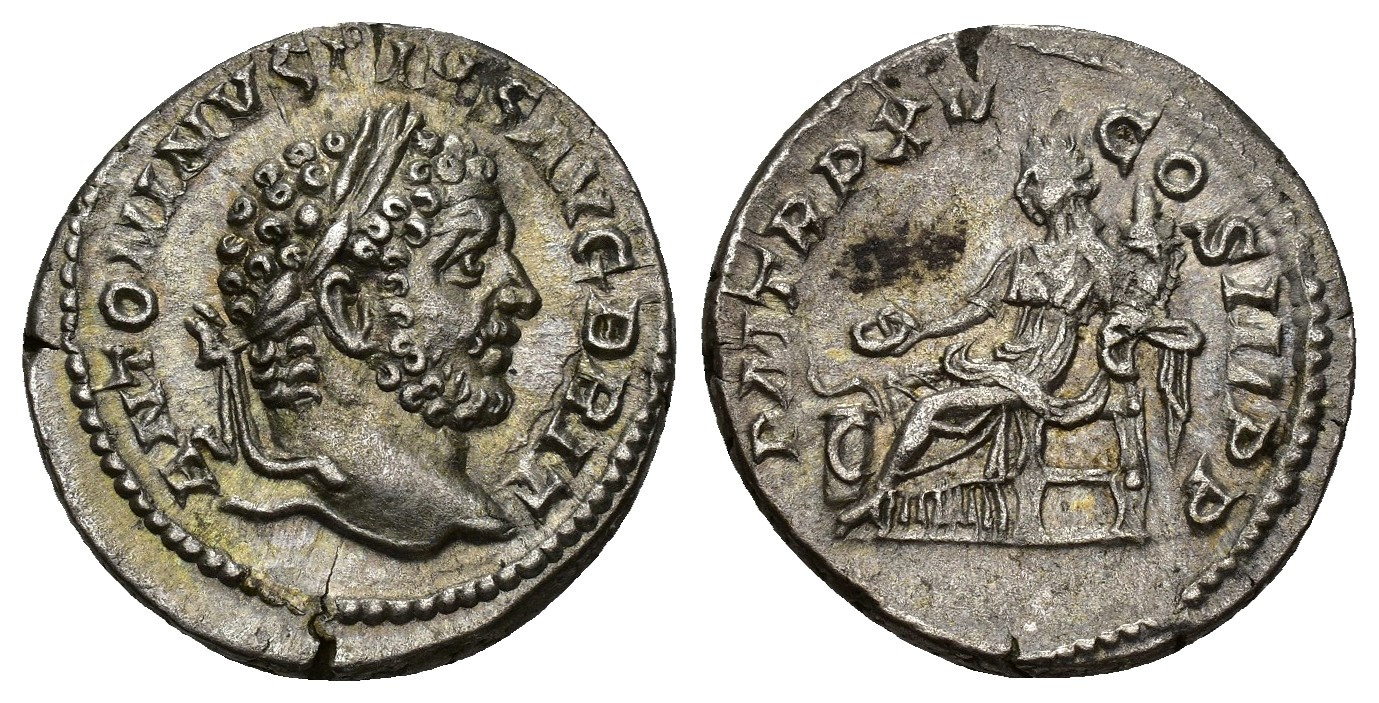 IMPERIO ROMANO. CARACALLA. Denario. Roma (212). A/ Busto laureado a der. R/ Annona sentada a izq. con espigas y cornucopia, delante modio; P M TR P XV COS III. AR 3,47 g. 18,56 mm. RIC-330. EBC-/MBC+.