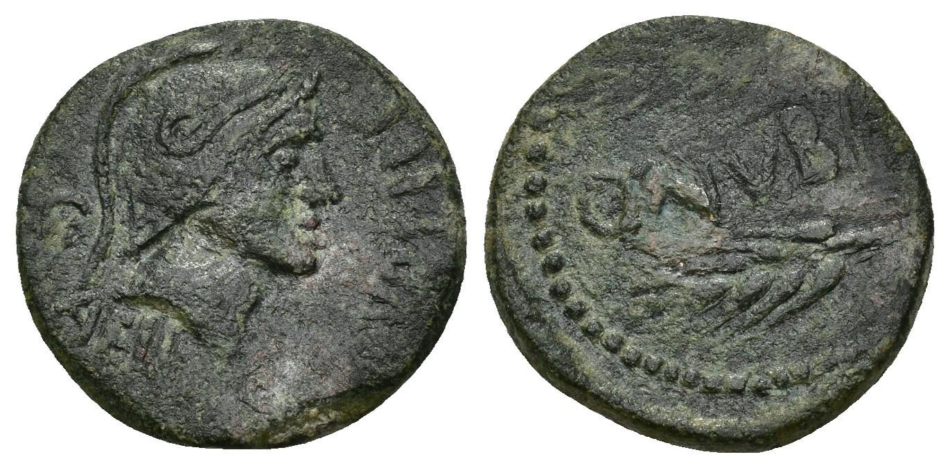 HISPANIA ANTIGUA. ONUBA. Semis. A/ Cabeza con casco a der.; C AELI (Q PV).BLILI. R/ Dos espigas a izq.; ONVBA. AE 3,87 g. 18,44 mm. I-1896. ACIP-2419. Campo del rev. repasado. Pátina oscura. MBC-. Rara. Compra privada Pliego (2003).