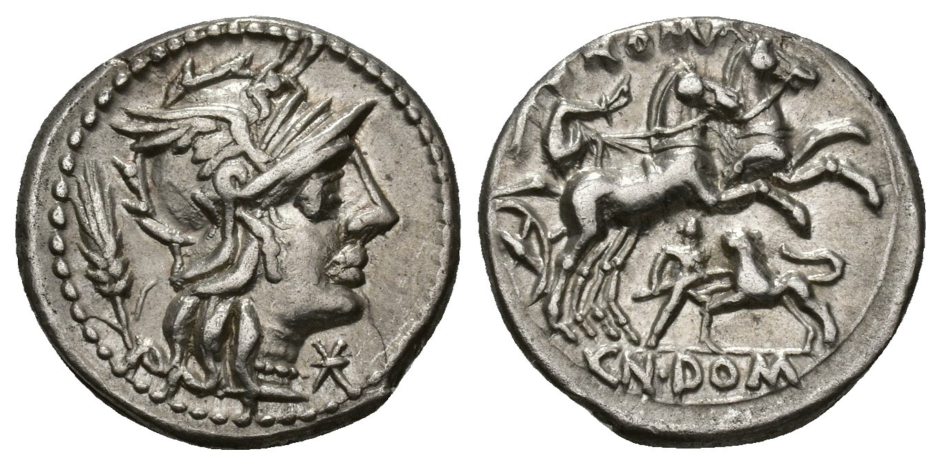 REPÚBLICA ROMANA. DOMITIA. Cn. Domitius Ahenobarbus. Denario. Roma (128 a.C.). A/ Cabeza de Roma a der., detrás espiga. R/ Victoria en biga a der., debajo soldado luchando contra un león, encima ROMA, en exergo CN DOM. AR 3,99 g. 18,00 mm. CRAW-261.1. FFC-680. EBC-/MBC+.