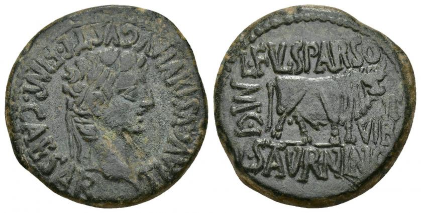 HISPANIA ANTIGUA. CALAGURRIS. Tiberio. As. A/ Cabeza laureada a der.; TI AVGVS DIVI F IMP CAESAR. R/ Toro a der., detrás M C I, delante II/VIR, encima L FVL SPARSO, debajo L SATVRNINO. AE 13,42 g. 28,2 mm. I-429. APRH-448d. ACIP-3128c. Raya en anv. Pátina verde. MBC/EBC-.