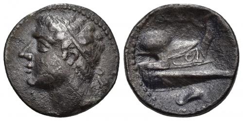 HISPANIA ANTIGUA. EMISIONES HISPANO-CARTAGINESAS. Shekel. A/ Cabeza masculina diademada a izq. R/ Proa a der., debajo delfín. AR 7,75 g. 20,3 mm. I-842. ACIP-543. Pátina plomiza. MBC+/MBC. Muy rara.