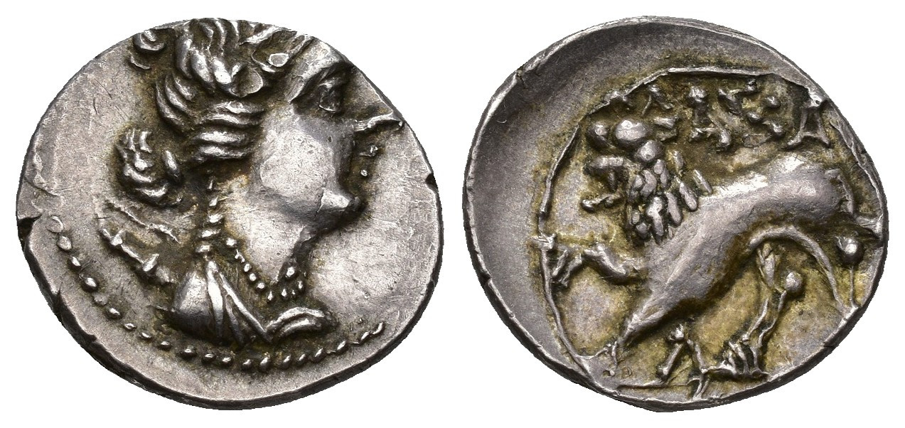 GRECIA ANTIGUA. GALIA. MASSALIA. Dracma (c. 130-121 a.C.). A/ Cabeza de Ártemis a der., detrás carcaj. R/ León a izq., encima MASSA, debajo L, exergo no visible. AR 2,70 g. 15,9 mm. SBG-77 vte. Descentrada. EBC-/MBC+.
