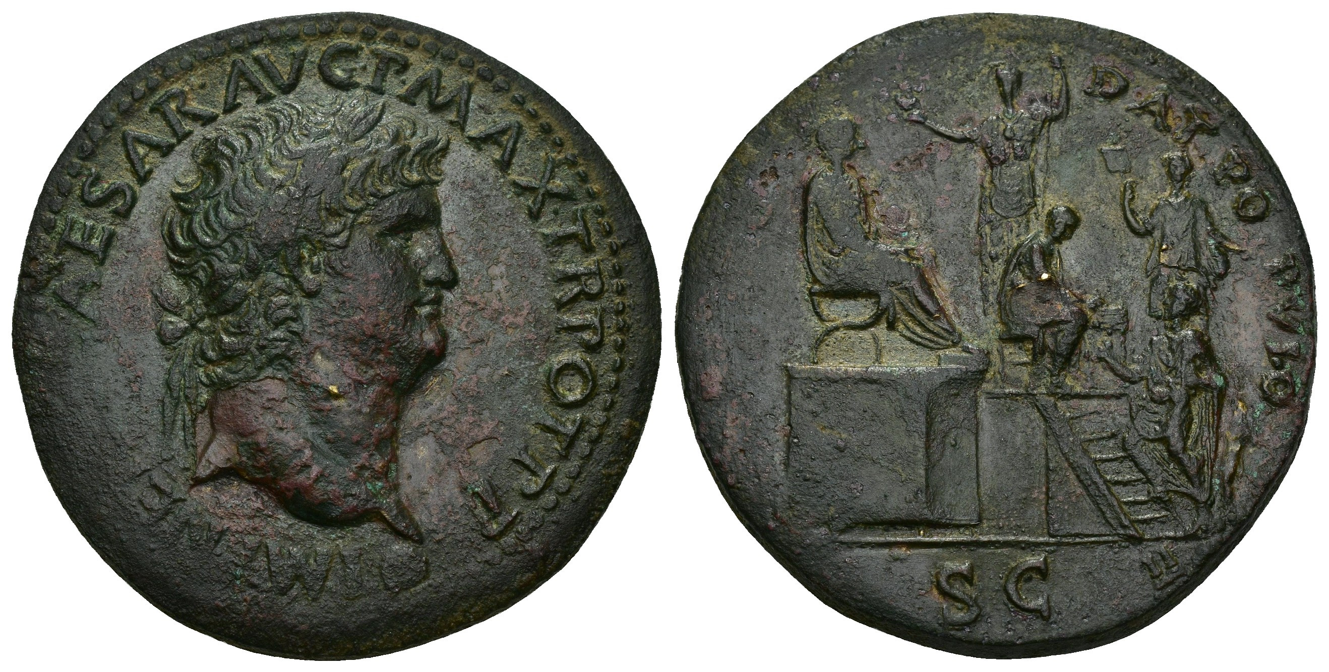 IMPERIO ROMANO. NERÓN. Sestercio. Lugdunum (62-68 d.C.). A/ Cabeza laureada a der.; IMP NE(RO C)AESAR AVG P MAX TR POT P P. R/ Nerón sentado a der. sobre plataforma, junto a él Minerva con lanza y lechuza, delante, sentado en lo alto de una escala, un oficial reparte el congiarium a un ciudadano que sube por ella, en campo Liberalitas con tésera; (...)DAT POPVLO II, en exergo S C. AE 27,31 g. 35,8 mm. RIC-no. Campos repasados. Pátina verde en tonos rojos. MBC+/MBC. Rarísima.