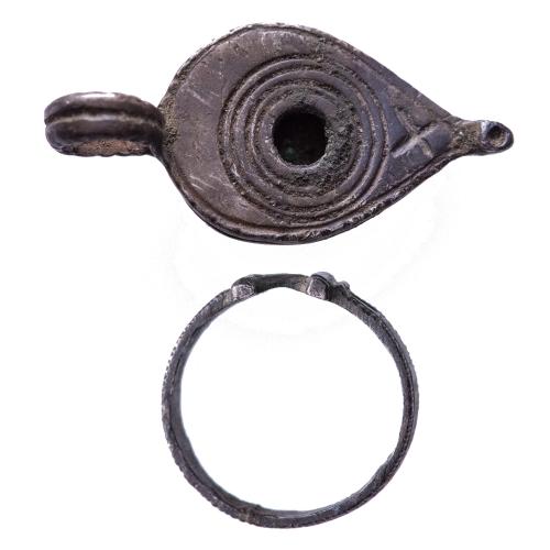 ARQUEOLOGÍA. BIZANCIO. Lote de 2 objetos: un broche o colgante en forma de lucerna y un anillo. Siglo V-VI d.C. Plata. Longitud de 1,9cm a 3,4 cm.