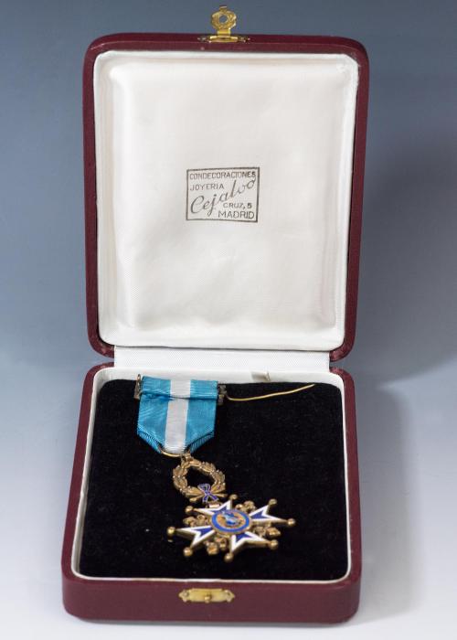 MEDALLAS Y CONDECORACIONES. FRANCISCO FRANCO. Caballero de la Orden de Carlos III. Cruz de cuello de comendador ordinario. Plata dorada con su estuche. 7,54 x 4,62 cm. G vte. por imgen de la Inmaculada en relieve.EBC.