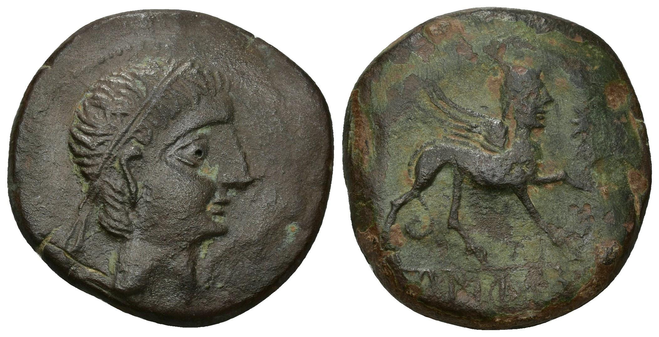 HISPANIA ANTIGUA. CASTULO. As. A/ Cabeza masculina diademada a der. R/ Esfinge a der., delante estrella, debajo KaSTiLO. AE 18,57 g. 29 mm. I-707. ACIP-2126. Pátina marrón y verde. MBC/BC+. Ex subasta Áureo, 47 (14-6-1994), lote 2117.