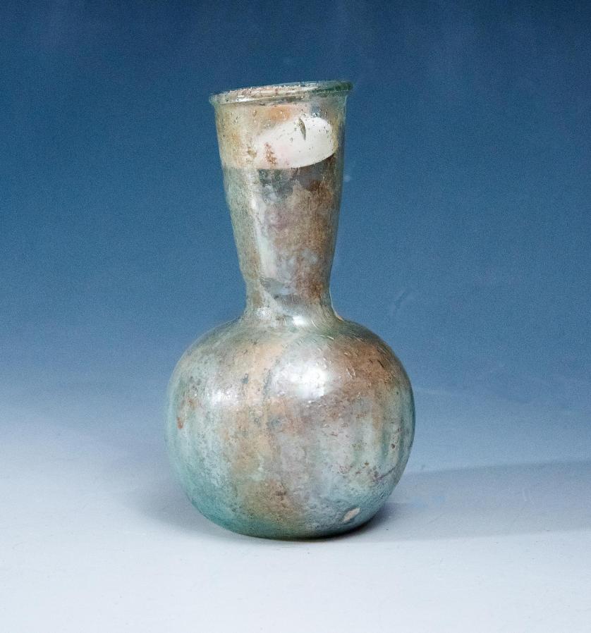 ARQUEOLOGÍA. ROMA. Imperio Romano. Ungüentario con boca ancha y panza ovalada (ss. I-III d.C.). Vidrio. Presenta irisaciones. Altura 11,5 cm.
