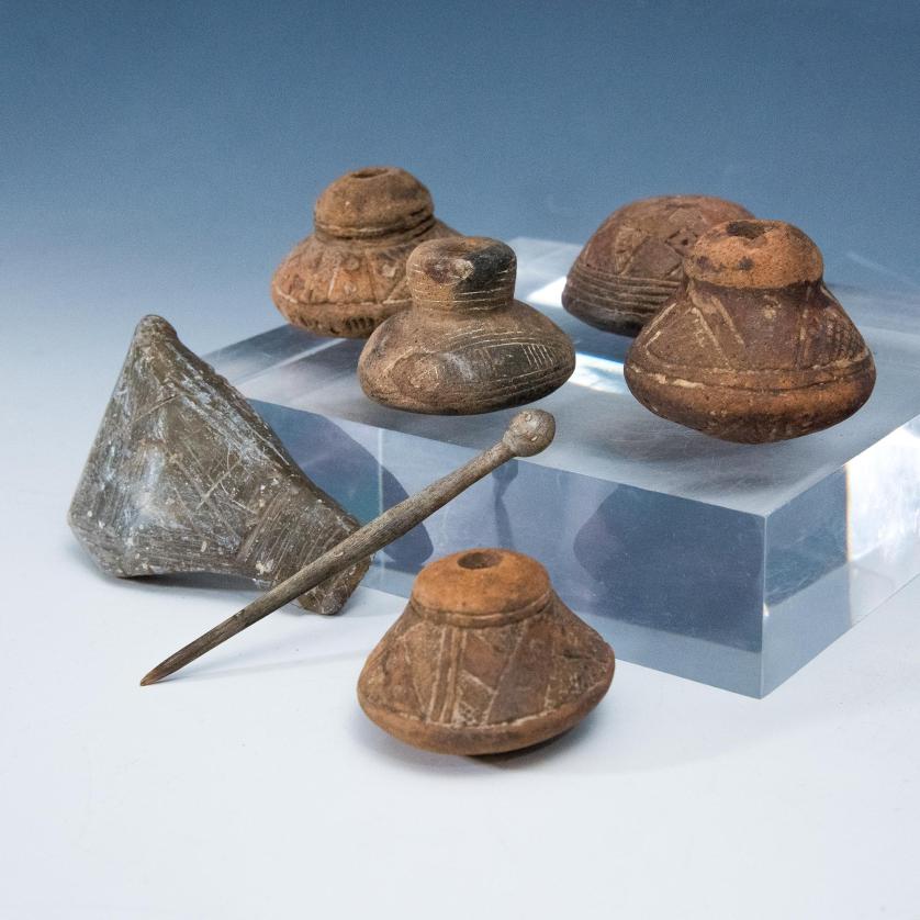 ARQUEOLOGÍA. PREHISPÁNICO. Lote de 7 utensilios: un hacha, cinco fusayolas y una aguja. Diferentes épocas y estilos. Cerámica y piedra. Longitud de 4 cm a 8 cm.