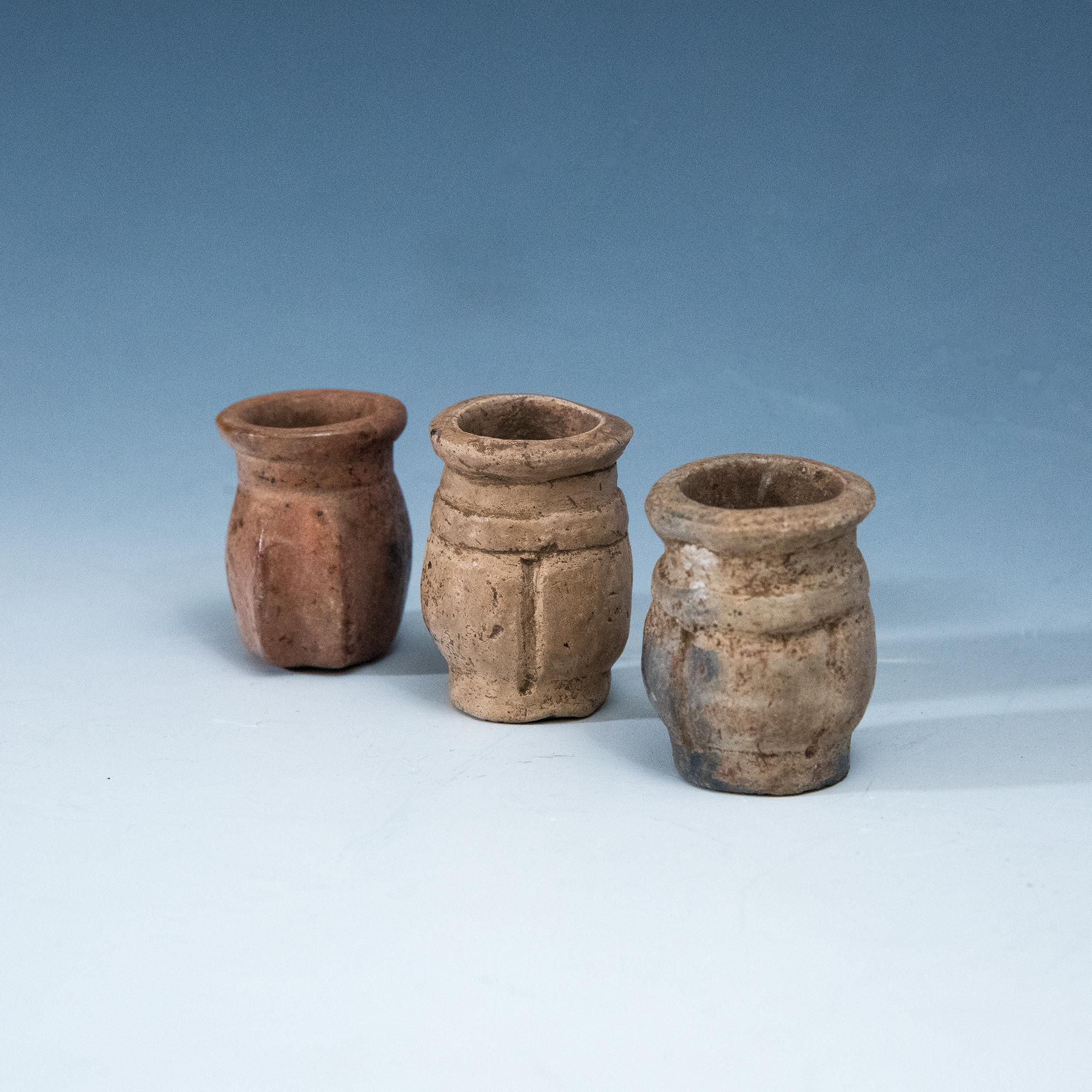 ARQUEOLOGÍA. PREHISPÁNICO. Cultura Maya. Lote de 3 frascos medicinales y/o de tabaco (600-800 d.C. ). Terracota. Altura de 3,2 a 3,5 cm.