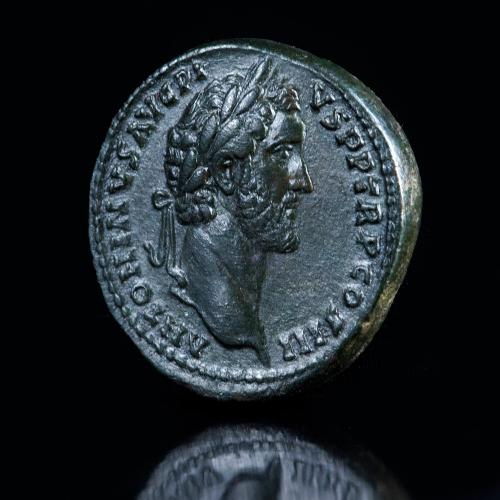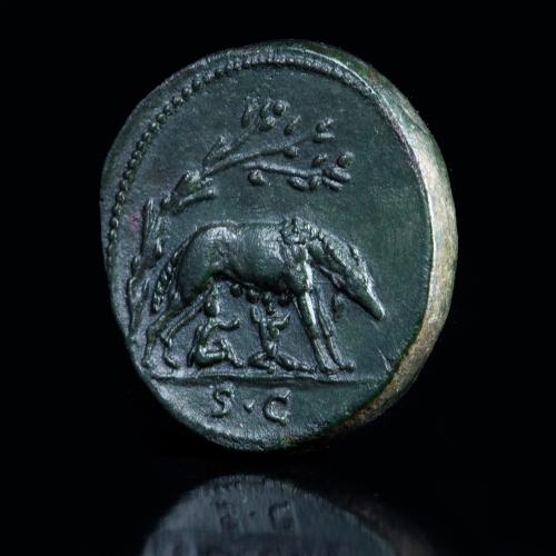 IMPERIO ROMANO. ANTONINO PÍO. Sestercio. Roma (140-144). A/ Cabeza laureada a der.; ANTONINVS AVG PIVS P P TR P COS III. R/ Loba a der. amamantando a los gemelos, detrás árbol, exergo SC. AE 27,22 g. 33,76 mm. RIC-630. EBC-. Pátina verde oscuro.