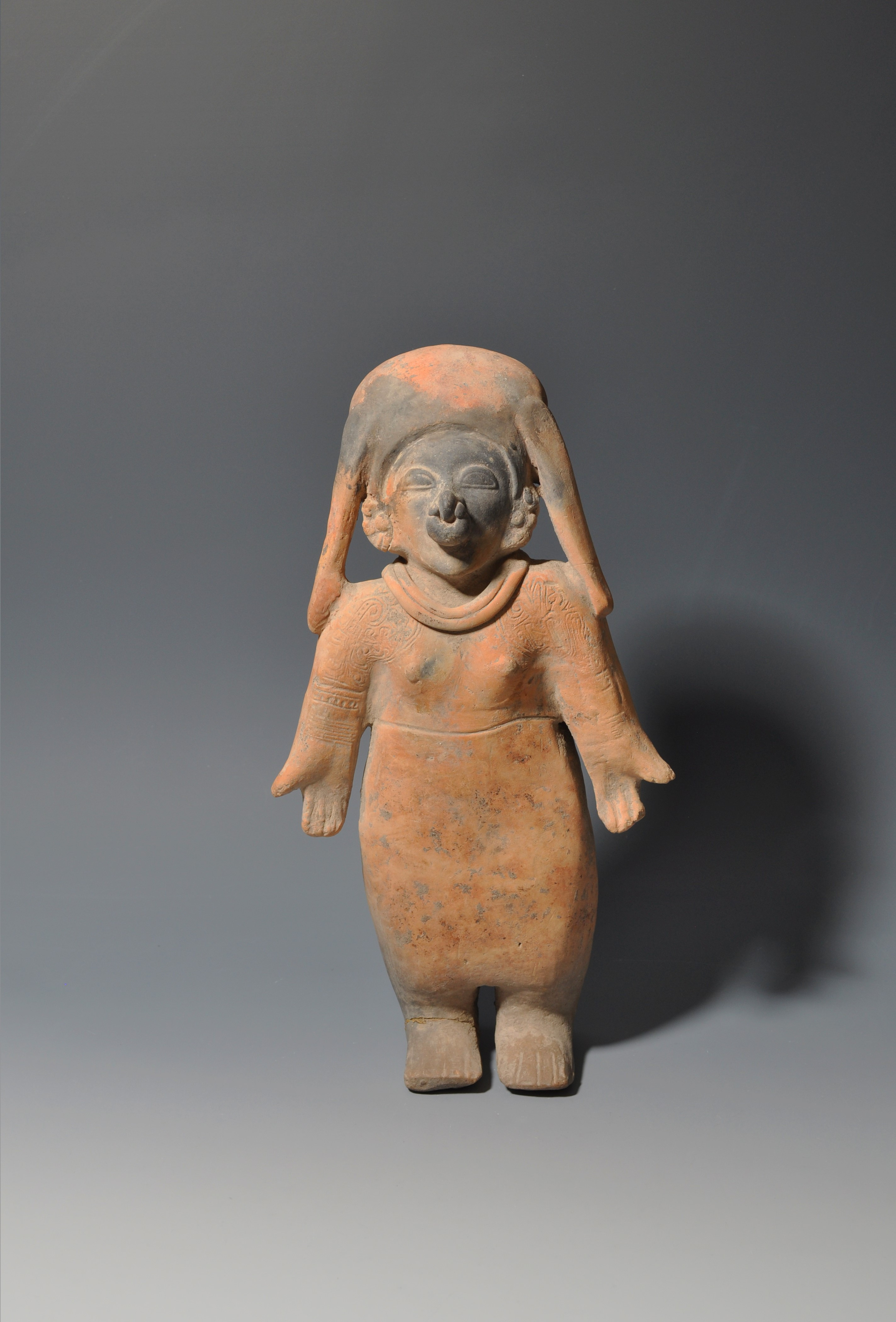 PREHISPÁNICO. Cultura Jama-Coaque. Figura femenina estante (500 a.C-500 d.C.). Cerámica. Altura 30 cm. Fragmentada y restaurada. Adjunta certificado de termoluminiscencia QED Laboratoire. Adjunta certificado de exportación de Alemania. Adjunta declaración de importación del Ministerio de Cultura de España (no sujeto a tasas de exportación).