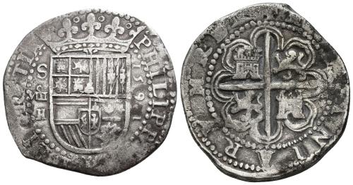 FELIPE II. 8 reales. 1591. Sevilla. H. AR 27,22 g. 41,77 mm. AC-734. Leves oxidaciones. MBC/MBC-. Extraordinario ejemplar con todos los datos visible y muy redondo. Muy raro así.