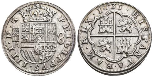FELIPE IV. 8 reales. 1635. Segovia. R. Ley. HISPANIARAM. AR 27,75 g. 40,28 mm. AC-1608. Leve plata agria en el rev. EBC-/MBC+.