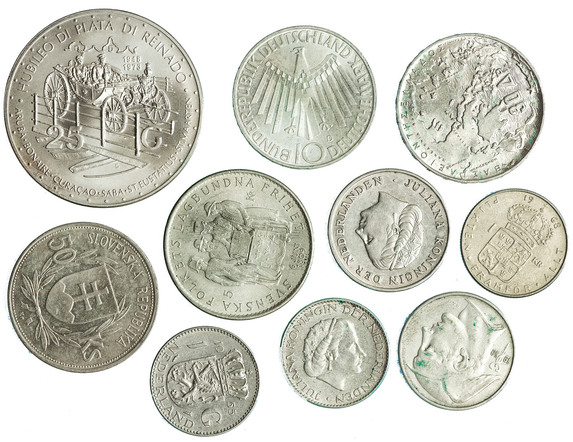 MONEDA EXTRANJERA. Lote de 21 piezsa: Países Bajos y Antillas (10), Eslovaquia (1), Suecia (4), Bélgica (1), Grecia (2) y Alemania (3). MBC/SC.