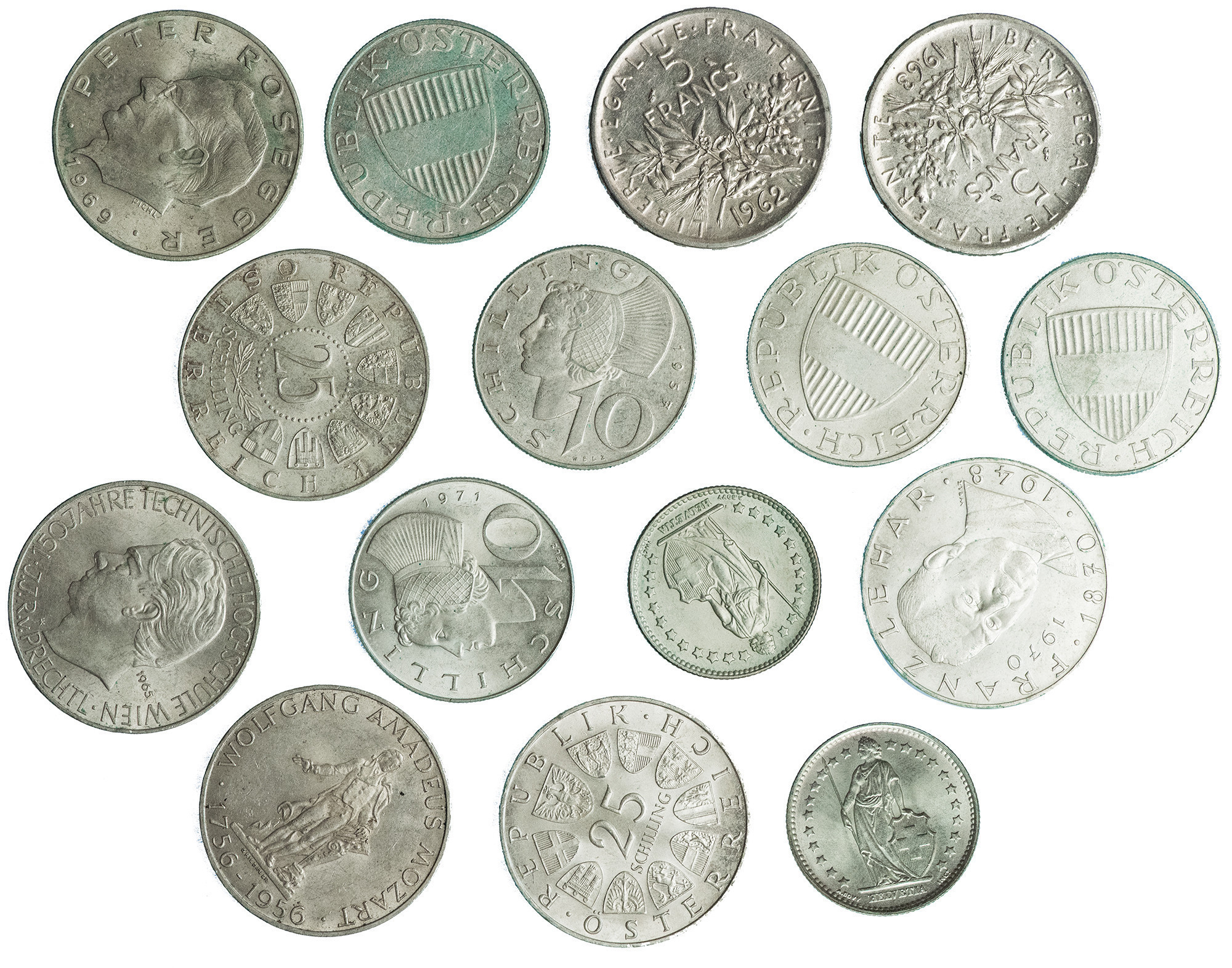 MONEDA EXTRANJERA. Lote de 25 piezas: Francia (3: 2 de 5 francos y 1 de 20 francos); Suiza (2 de 1 francos, 2 francos y 7 de 5 francos); Austria (5 de 10 Schilling y 6 de 25 Schilling).