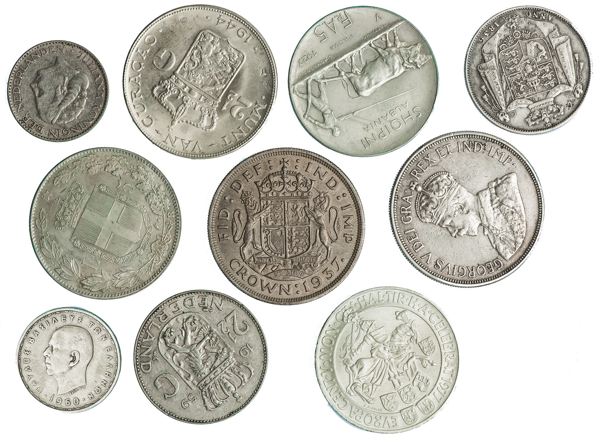 MONEDA EXTRANJERA. Lote de 15 piezas: Países Bajos (5: 4 de 2 1/2 Gulden y 1 Gulden); Chipre (1: 5 piastras); San Marinno (1: 5 liras); Finlandia ( 1: 25 markaa); Italia (1: 5 liras); Albania (1: 5 F); Austria (2: 100 Schilling); Gracia (1: 20 dracmas); R. Unido ((2: corona y 1/2 corona de 1836).