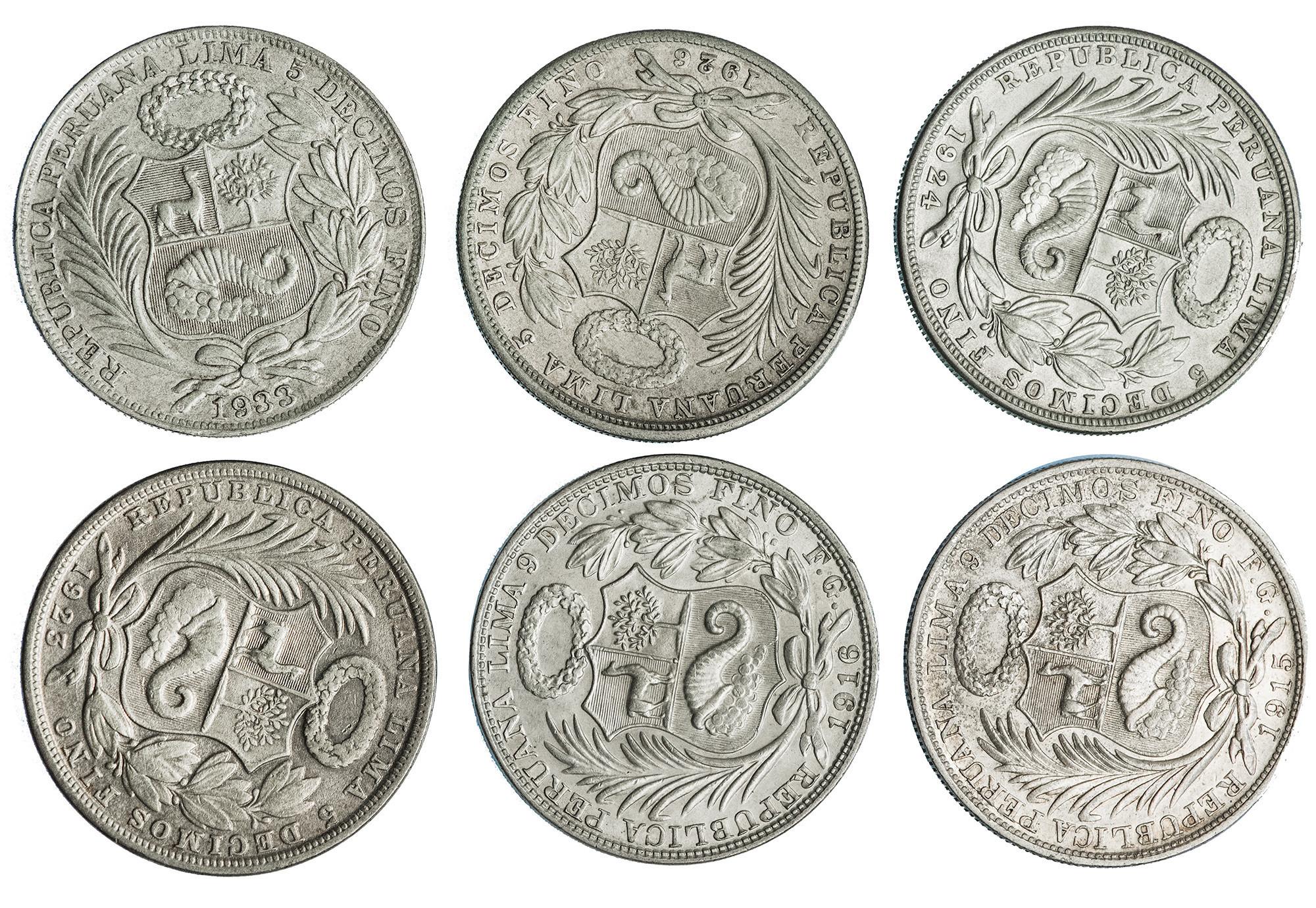 PERÚ. Lote de 6 monedas de 1 sol: 1915, 16, 23, 24 y 33. KM-196.26 al KM-218.2. MBC+/EBC-.