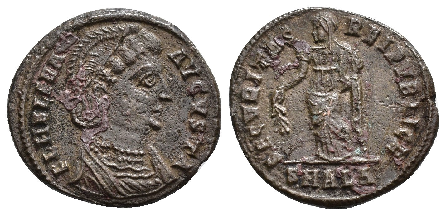 IMPERIO ROMANO. HELENA. Follis. Alejandría (325-326). A/ Busto drapeado a der.; FL HELENA AVGVSTA. R/ Securitas a izq.; SECVRITAS REI PVBLICE. -/-//SMALA. 2,65 g. 19,2 mm. RIC-38- Superficies erosionadas. MBC-/MBC.