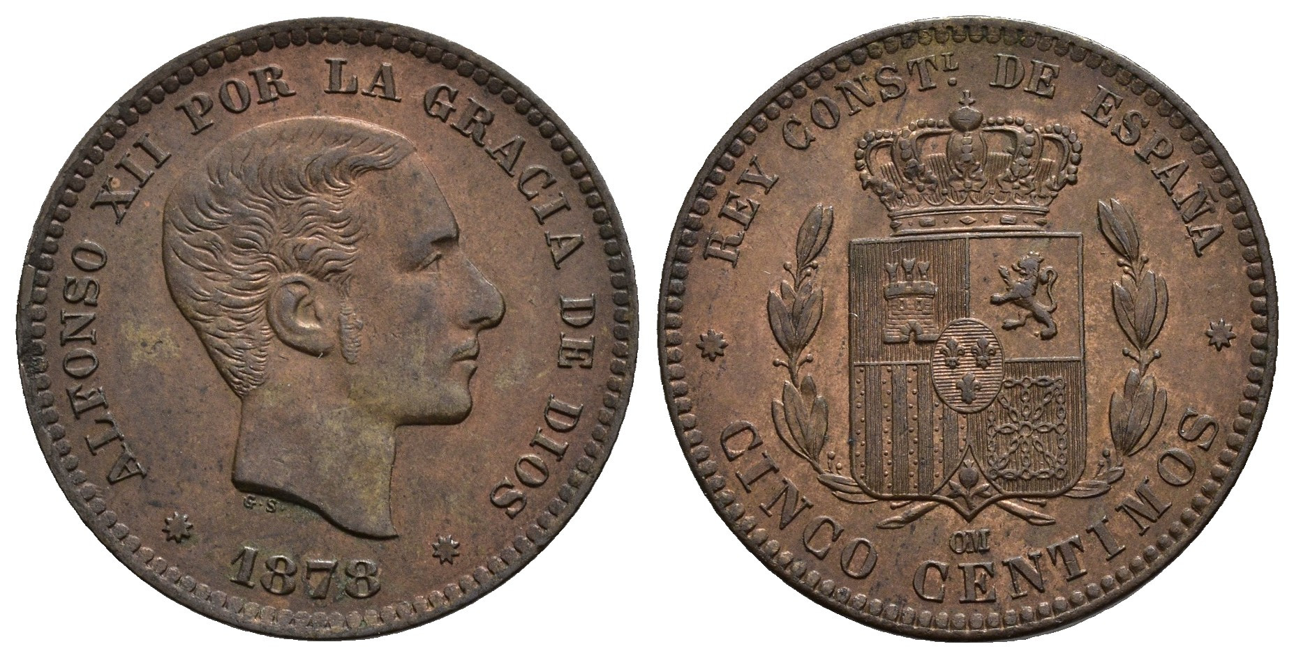 ALFONSO XII. 5 céntimos. 1878. OM. AE 5,08 g. 25,1 mm. VI-43. Punto de óxico. R.B.O. EBC-.