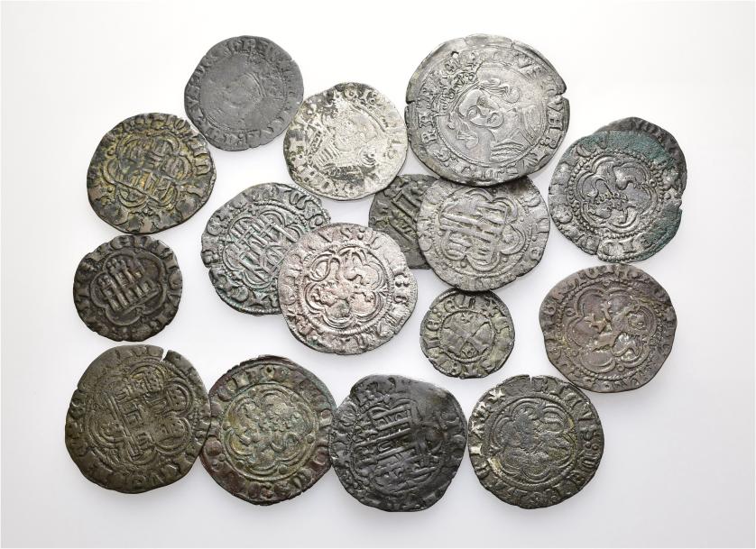REINOS DE CASTILLA Y LEÓN. REINOS DE CASTILLA Y LEÓN. Lote de 17 piezas: Enrique III (7 blancas, 1/2 blanca y seisén); Juan II (2 blancas y 2 cornados); Enrique IV (cuartillo de Burgos con agujero, cuarto, 1/2 cuarto y 1 dinero). Varias cecas. MBC-/MBC+.