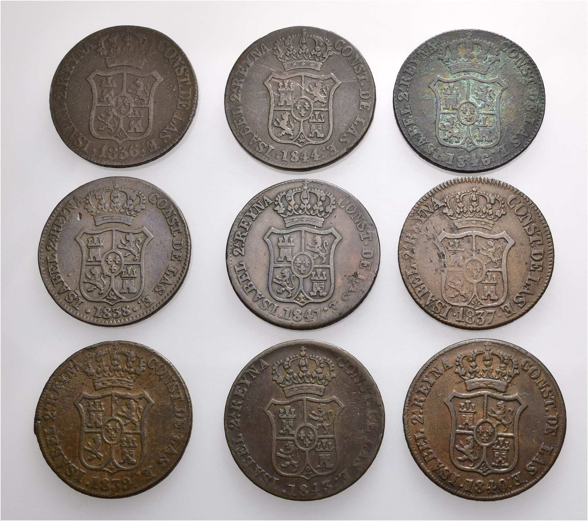 ISABEL II. Lote de 9 piezas de 3 quartos, Barcelona, 1836, 1837, 1838, 1839, 1840, 1841, 1843, 1844 y 1846. MBC-/MBC+.