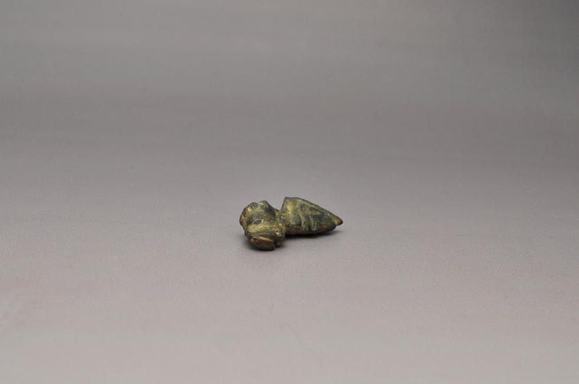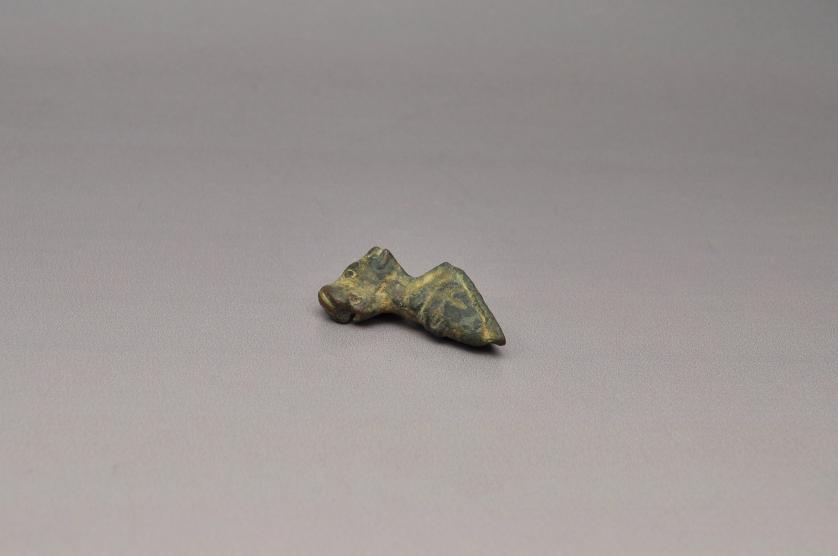 ARQUEOLOGÍA. HISPANIA ANTIGUA. Cultura ibérica. Aplique en forma de cabeza de Hércules con león (ss. VI-II a.C.). Bronce. Altura 4,5 cm.