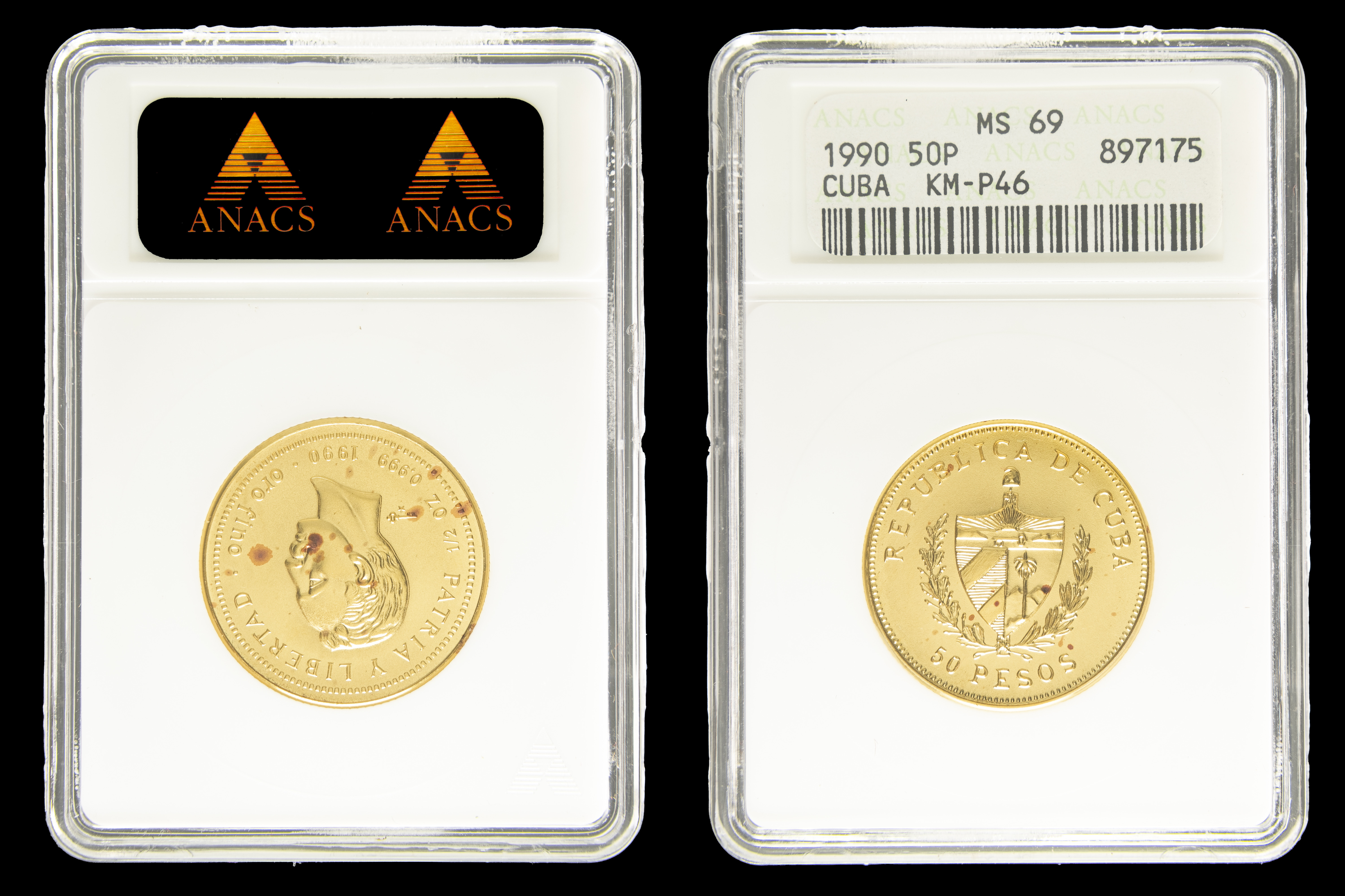 Cuba. 50 pesos. Piefort. 1990. José Martí. AU 31,10 g. 26 mm. KM-P46. Encapsulada por ANACS MS 69. Manchitas cobrizas. Rara. Acuñación de 12 piezas.