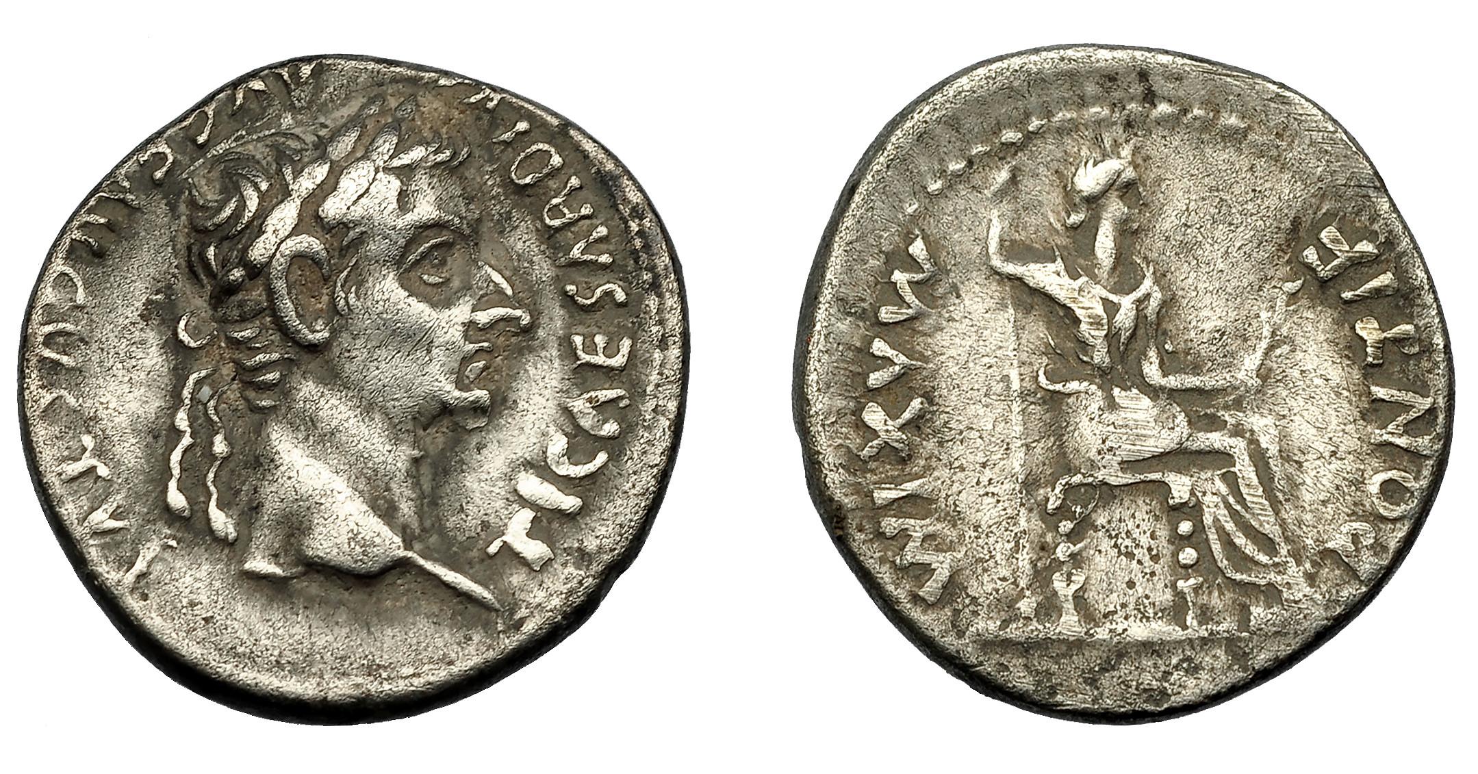 IMPERIO ROMANO. TIBERIO. Denario. Lugdunum (36-37 d.C.). A/ Busto laureado a der. R/ Livia sentada a der. en silla con patas ornamentadas y sobre línea; PONTIF MAXIM. AR 3,67 g. 18,5 mm. RIC-30. Rayitas. MBC-.