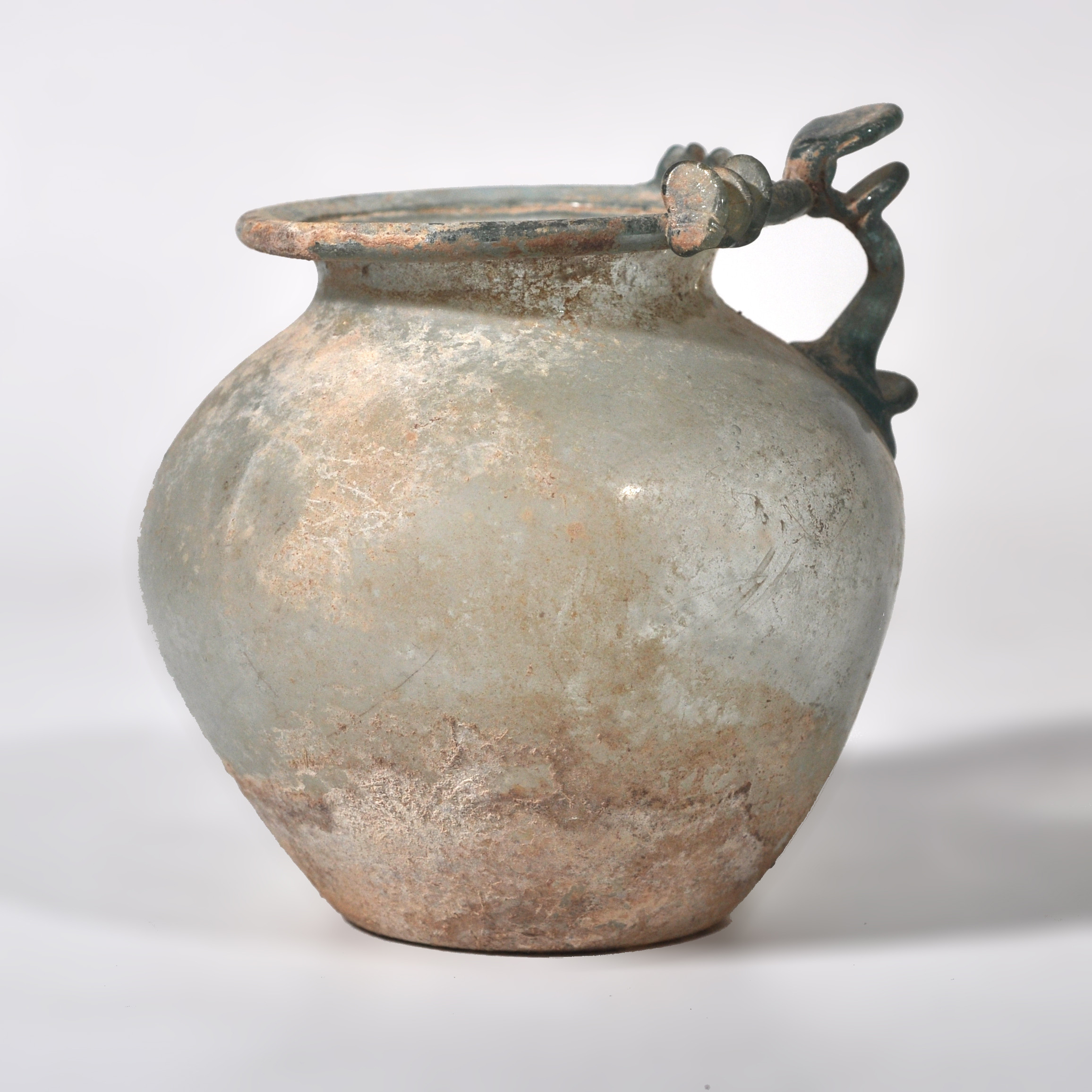 ROMA. Imperio Romano. Jarra de cuerpo globular con asa decorada. Irisaciones. Vidrio. Altura 8,5 cm.