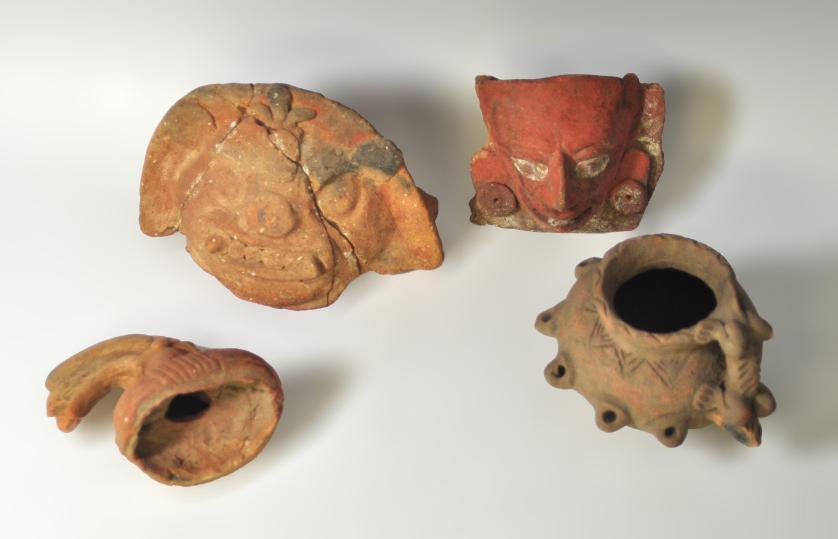 PREHISPÁNICO. Lote de 4 fragmentos de épocas y culturas diversas. Cerámica. Todos ellos fragmentados, uno de ellos parcialmente reconstruido. Longitud 9 cm y 17 cm.