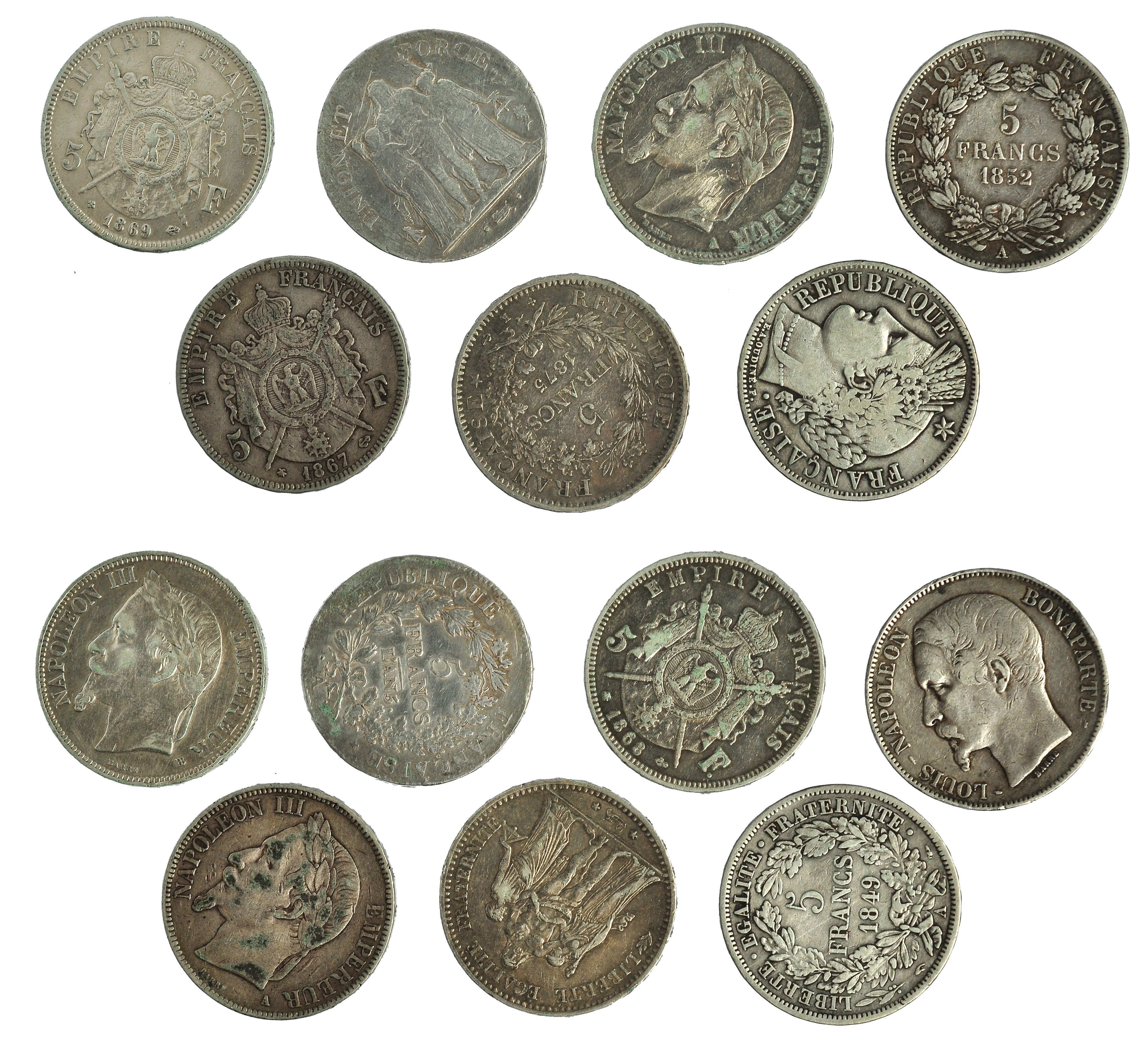 MONEDAS EXTRANJERAS. FRANCIA. Lote de 7 piezas de 5 francos. Una BC, las demás MBC/MBC+.
